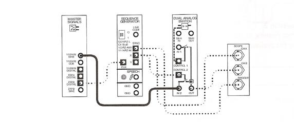 Заметьте, что несущая ASK сигнала и тактовая частота генератора последовательности одинаковой частоты (20 кГц). Более того, у них общий источник – MasterSignalsmodule. Это было сделано для того, чтобы ASK сигнал легко просматривался на осциллографе. Однако, это делает настройку непрактичной как реальную ASK систему связи, потому что частота несущей и собственная частота сигнала практически одинаковы. По причинам, изложенным в лабораторное работе, посвященной АМ, восстановление сигнала данных очень сложное, если невозможное. В идеальном случае, несущая частота должна быть намного выше чем скорость передачи цифрового сигнала (который задается тактовой частотой модуля генератора последовательности). Следующая часть лабораторной работы позволит настроить частоту несущей. В процессе, выходной сигнал модуля DualAnalogSwitch будет выглядеть как обычный ASK сигнал. 178. Соберите схему: Не изменяйте положение проводов, показанных пунктирными линиями.