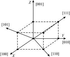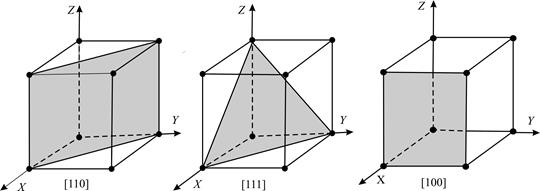 На рис. 5 показані кристалографічні площини, що проходять через діагоналі двох протилежних граней кубічної гратки, характеризуються індексами [110], [111] і площина, яка характеризується індексами [110].