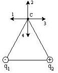 C) Если q1 = -q, q2 = +q, a расстояние между зарядами и от зарядов до точки С равно а, то вектор напряженности поля в точке С ориентирован в направлении...