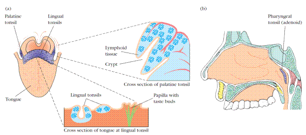 Figure 7. Three types of tonsils. (a) The position and internal features of the palatine and lingual tonsils; (b) a view of the position of the nasopharyngeal tonsils (adenoids). [ Part b adapted from J. Klein, 1982, Immunology, The Science of Self-Nonself Discrimination, © 1982 by John Wiley and Sons, Inc. ]