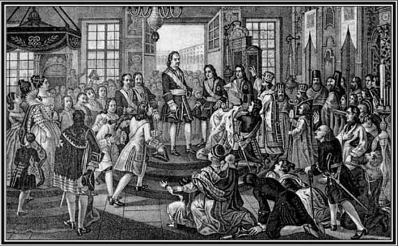 Царь Петр I принимает титул Отца Отечества, Всероссийского императора и Великого. 1721 г. Неизвестный мастер. Литография по рисунку П. Иванова.