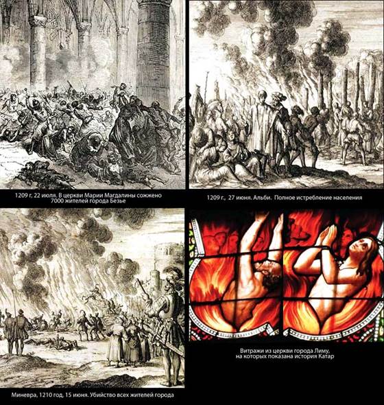 Само окружающее католическое население к ним относилось совсем неплохо, что видно из правдивых показаний трудящихся, добытых многочисленными инструментами, которые вы сейчас можете видеть в музеях пыток, – оставленных, так сказать, в назидание другим еретикам. Соседи считали их «добрыми христианами, которые имеют большую силу спасать души». В 1179 году Третий Латеранский собор католической церкви осудил катарскую ересь. В 1209 году папа Иннокентий III призвал к крестовому походу против катаров, получивший название альбигойского (от названия города Альби). Это тогда, в Безье были произнесены слова Папского легата, когда растерянный крестоносец спросил его, как отличить христиан от неверных? Легат спокойно ответил: «Режьте всех, бог отличит своих»... Всего в Безье было без жалости истреблено более 20 000 человек – всё население. Аналогично поступили в Марманде, Минерве, Лаворе, – повсюду раскладывались огромные массовые костры. Население сопротивлялось по мере сил крестоносцам – и в 1226 г. Людовик VIII Французский собрал еще один крестовый поход. На этот раз зачистили основательно. И далее пошли затяжные «альбигойские» войны. Пишут, что в в число их жертв попало около миллиона человек.