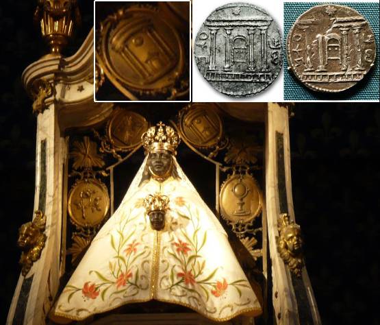 На фото Девы в верхнем ряду картуш, оформленный как вход в храм с четырьмя колоннами, между которыми ковчег. Это – табернакль, в православной традиции называется кивот(ковчег). Для сравнения – рядом еврейские монеты с изображением храма и Ковчега Завета в нём. Несвойственный символ для Девы Марии. Изображения Южной Царицы часты на внешних стенах готических храмов. В Шартре их два. На одном из них ковчег катится от Мельхиседека к царице Саваской.