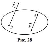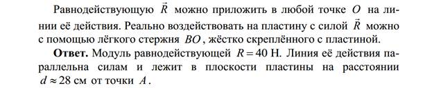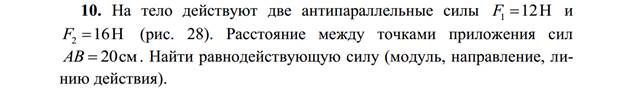 Поставим вопрос так: где на отрезке AB расположить ось вращения тела O, чтобы под действием F1 и F2 тело оставалось неподвижным? Уравнение моментов относительно оси O: F2*OB - F1*OA = 0. Учитывая, что OA + OB = AB = 100 см, получаем: OA = AB*F2/(F1 + F2) = 100*20/(30 + 20) = 40 см; OB = AB*F1/(F1 + F2) = 100*30/(30 + 20) = 60 см. Поскольку тело неподвижно, значит реакция оси O полностью уравновешивает суммарное действие F1 и F2, т.e. их равнодействующую; сл-но они приложены к одной точке. Примечание: строго говоря, согласно одной из аксиом статики, точку приложения силы можно как угодно переносить вдоль направления вектора силы без изменения действия силы, т.e. в данном случае вдоль прямой, проведенной через ось O параллельно силам F1 и F2.
