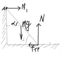 Решение. Необходим чертеж! Постарайся понять без него. а лестницу действуют силы: 1). сила тяжети, приложенная в центре лестницы; 2). реакции опоры стенки и земли, направленныесоответственно перпендикулярно стенке и земле; 3). сила трения, направленная горизонтально к стене. Составляем уравнения авенства сил и правило моментов сил: m*g*05*L*sin(a)-N2*L*cos(a)=0; Ft=N2; Ft=k*N1; m*g=N1; N2=0,5*m*g*tg(a); 0,5*m*g*tg(a)=k*m*g; tg(a)=2*k; k=0,5; tg(a)=1; a=45 градусов.