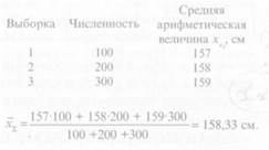 Пример. Вычислить взвешенную среднюю арифметическую величину при следующих данных по измерению длины тела для трех выборок:
