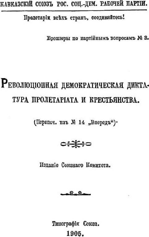 Обложка брошюры В. И. Ленина «Революционная демократическая диктатура пролетариата и крестьянства». — 1905 г. _______________ РЕВ. ДЕМ. ДИКТАТУРА ПРОЛЕТАРИАТА И КРЕСТЬЯНСТВА______________ 23 с другой стороны, было бы в состоянии на деле провести полную свободу на время выборов. И вот спрашивается, позволительно ли социал-демократической рабочей партии участвовать в таком временном революционном правительстве? Вопрос этот поставили впервые представители оппортунистического крыла нашей партии, именно Мартынов, еще до 9 января, причем он, а вслед за ним и «Искра», решили этот вопрос отрицательно. Мартынов старался довести до абсурда взгляды революционных социал-демократов, пугая их тем, что в случае успешной работы над организацией революции, в случае руководства вооруженным народным восстанием со стороны нашей партии, нам придется участвовать во временном революционном правительстве. А такое участие есть недопустимый «захват власти», есть непозволительный, для классовой социал-демократической партии, «вульгарный жоресизм». Остановимся на рассуждениях сторонников этого взгляда. Находясь во временном правительстве, говорят нам, социал-демократия будет держать в руках власть; а социал-демократия, как партия пролетариата, не может держать в руках власть, не пытаясь осуществить нашей программы-максимум, т. е. не пытаясь осуществить социалистического переворота. А на таком предприятии она неизбежно в настоящее время потерпит поражение и только осрамит себя, только сыграет на руку реакции. Поэтому-де участие социал-демократии во временном революционном правительстве недопустимо. Это рассуждение основано на смешении демократического и социалистического переворотов, — борьбы за республику (включая сюда и всю нашу программу-минимум) и борьбы за социализм. Пытаясь немедленно поставить своей целью социалистический переворот, социал-демократия действительно лишь осрамила бы себя. Именно против подобных смутных и неясных идей наших «социалистов-революционеров» и воевала, однако, всегда социал-демократия. Именно поэтому настаивала она всегда на буржуазном характере предстоящей России революции, именно поэтому строго 24___________________________ В. И. ЛЕНИН требовала отделения демократической программы-минимум от социалистической про-граммы-максимум. Забыть все это могут во время переворота отдельные социал-демократы, склонные пасовать перед стихийностью, но не партия в целом. Сторонники этого ошибочного мнения впадают в преклонение перед стихийностью, думая, что ход вещей заставит социал-демократию, в таком положении, взяться вопреки ее воле за осуществление социалистического переворота. Если бы это было так, тогда, значит, неверна была бы наша программа, тогда она не соответствовала бы «ходу вещей»: преклоняющиеся перед стихийностью люди как раз и боятся этого, боятся за верность нашей программы. Но их боязнь (психологическое объяснение которой мы старались наметить в наших фельетонах) неосновательна до последней степени. Наша программа верна. Именно ход вещей подтвердит ее непременно, и чем дальше, тем больше. Именно ход вещей «навяжет» нам безусловную необходимость отчаянной борьбы за республику, именно он практически направит как раз в эту сторону наши силы, силы политически-активного пролетариата. Именно ход вещей неизбежно навяжет нам