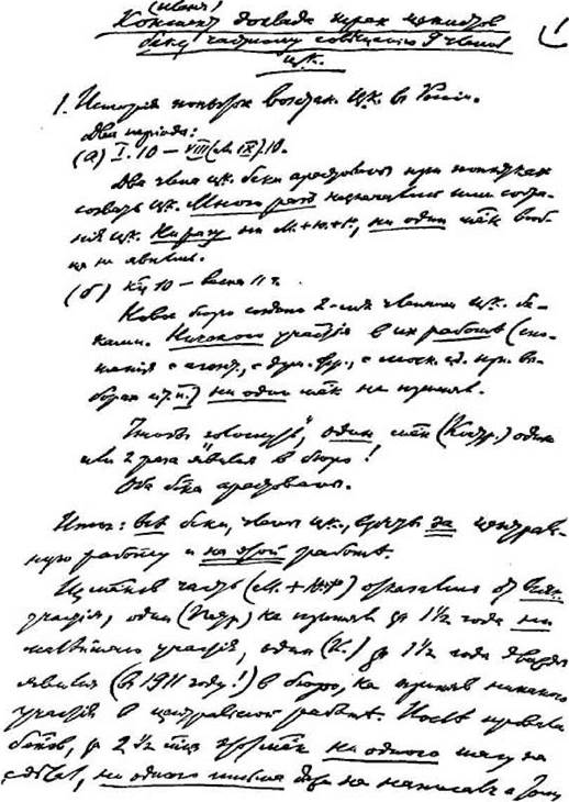 Первая страница рукописи В. И. Ленина «Конспект (план) доклада трех цекистов беков частному совещанию девяти членов ЦК». — 1911 г. Уменьшено __________________________ СОВЕЩАНИЕ ЧЛЕНОВ ЦК РСДРП________________________ 259 в ЗБЦК и никем не признанное!), мы считаем прямо издевкой. 2. Возможно ли теперь восстановление заграничного пленума? Юридически: налицо 9 человек из 15. Формально они могут (а) провозгласить себя пленумом. Будучи бесспорным формально, такой шаг, вероятно, возможен лишь перевесом одного голоса, т. е. решением 5, из этих 9, против 4. На деле значение такого формально безупречного шага ничтожно: не подлежит сомнению, что роли ЦК выполнить невозможно при таких условиях. (б). Формально возможно также, что эти наличные 9 членов Τ TTC станут свозить из России имеющих права кандидатов. Что это будет означать на деле? Меки могут «свезти» либо своих ликвидаторов (Михаила + Юрия + Романа и т. п.), которых за членов ЦК после известного выступления Михаила + Юрия + Романа ни один из честных партийцев не признает; — либо двух цекистов, бывших на пленуме в I. 1910ис тех пор, за 1V2 года, никакой центральной работы не делавших. Срок, в течение которого можно их свезти, неопределенен. Беки могут свезти еще двух своих кандидатов в дополнение к 3-м наличным бекам. Чтобы свезти этих кандидатов, нужны месяцы и месяцы работы для сношения с ссыльными, организации побегов, устройства средств жизни для семей и т. д. и т. п. Сколько месяцев понадобится для этой «работы», сказать невозможно. Реальное значение для партии этой неопределенна долгой работы своза «формальных» кандидатов, неспособных теперь на деле вести в России центральной работы, будет не только нолем. Оно будет хуже ноля, ибо заслонит от местных партийных групп печальную, требующую энергичной инициативы, действительность игрой в распределение мест наверху. После 1 /г лет безуспешного восстановления Τ TTC угощать партию еще и еще «завтраками»: завтра будет «у вас» Τ TTC — это значило бы издеваться над партией. Мы в таком издевательстве участвовать не намерены. 260__________________________ В. И. ЛЕНИН 3. Нечего и говорить, что попытки собрать теперь кандидатов в России, чтобы вос 4. Реальное положение партии сейчас таково, что на местах почти везде имеются со Некоторое, хотя небольшое, влияние среди части питерских рабочих эта антипартийная фракция несомненно имеет. Доказано вполне, что никакому ЦК она не подчиняется и по мере сил работе с.-д. мешает (до сих пор она не призвала прямо к выборам в IV Думу и продолжает заигрывать с отзовистами). Несравненно более серьезную антипартийную и антисоциал-демократическую силу представляет фракция независимых легалистов («Наша Заря» + «Дело Жизни» + «Голос С.-Д.»). Доказано вполне, что никакому Τ TTC они не подчиняются, издеваясь публично над его решениями. Проводить резолюции пленума («не принижать» значения нелегальной партии и т. д.) они не могут, ибо не хотят. Они не могут не вести обратной линии. __________________________ СОВЕЩАНИЕ ЧЛЕНОВ ЦК РСДРП________________________ 261 Ни один добросовестный с.-д. не может усомниться в том, что «независимые легали-сты» ведут подготовку выборов в IV Думу и проведут эти выборы помимо и против партии. Задача партийцев ясна: не допускать дольше ни малейшей оттяжки, не откладывать прямого выступления против независимых легалистов ни на день, открыто и решительно призвать партийные рабочие кружки 