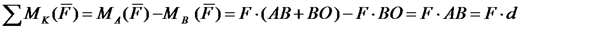 Если величина момента силы относительно точки зависит от выбора точки, относительно которой рассматривается момент силы, то момент пары сил не зависит от выбора точки. На рис. 45 можно увидеть доказательство того, что момент пары сил не зависит от выбора точки. Например, выбирается точка О на продолжении отрезка АВ, которая перпендикулярна линиям действий сил, составляющих пару. Если записать сумму моментов двух сил пары относительно этой точки О, то получим величину момента пары сил, которая не зависит от выбора точки, а зависит от расстояния между силами и направления пары сил. Вектор момента пары сил перпендикулярен плоскости, где находится пара сил, направление вектора определяется по правилу буравчика: если смотреть на конец вектора момента, то вращение его должно быть против часовой стрелки.