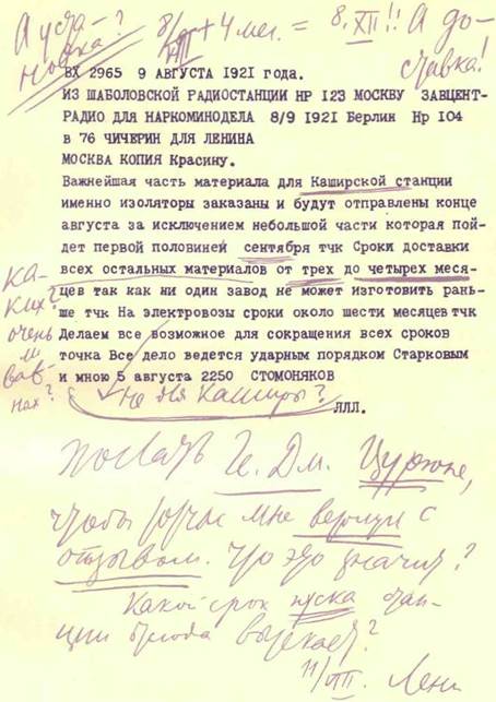 Пометки на радиотелеграмме Б. С. Стомонякова и поручение секретарю. — 11 августа 1921 г. Уменьшено ТЕЛЕФОНОГРАММА Г. В. ЧИЧЕРИНУ. 11 АВГУСТА 1921 г. Прошу тотчас проголосовать в Политбюро по телефону. Эту мою записку всем показать и собрать голоса. Ленин Образцом надо взять германское и норвежское правительства. Иной подход отвергнуть с мотивом, ясным для всех, и громогласно сказать на весь мир. Скрытых интервенционистов надо поймать (Уншлихта взять на помощь). Аппарат Компомощи подтянуть (если нет сил, заимствовать на 2 месяца у военных). В ближайшие дни особенно важна коллегиальная работа, ибо политическая ответственность за это труднейшее дело громадна. Ленин P. S. Нужны тонкие маневры. Ряд мер, особо строгих. Гувер и Браун наглецы и лгуны. Условия поставить архистрогие: за малейшее вмешательство во внутренние дела — высылка и арест. Написано 11 августа 1921 г. Печатается впервые, по рукописи 184 ТЕЛЕФОНОГРАММА Г. В. ЧИЧЕРИНУ Чичерину, копия Каменеву Как только придут сколько-нибудь обстоятельные сведения от Литвинова о его переговорах с Брауном, прошу мне сообщить главнейшие результаты по телефону. Ленин Написано 11 августа 1921 г. Впервые напечатано в I960 г. в книге «Документы внешней политики СССР», т. IV Печатается по машинописной копии