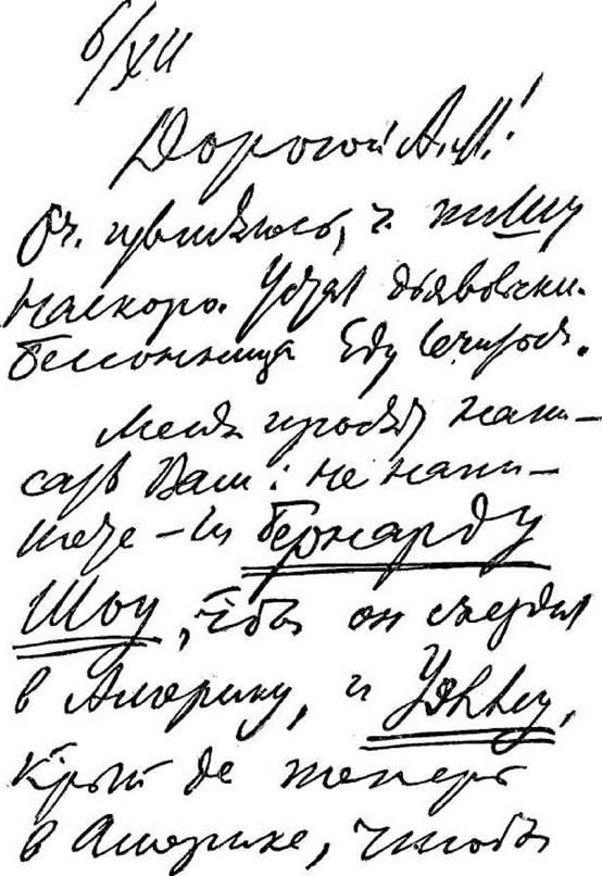 Я 1 99 1 90 условиях. Адрес: Ялта, районное санитарно-курортное управление. Ленин Впервые напечатано в 1933 г. Печатается по рукописи в Ленинском сборнике XXIII 120 А. М. ГОРЬКОМУ 6/ХП. Дорогой А. М.! Очень извиняюсь, что пишу наскоро. Устал дьявольски. Бессонница. Еду лечиться. Меня просят написать Вам: не напишете ли Бернарду Шоу, чтобы он съездил в Америку, и
