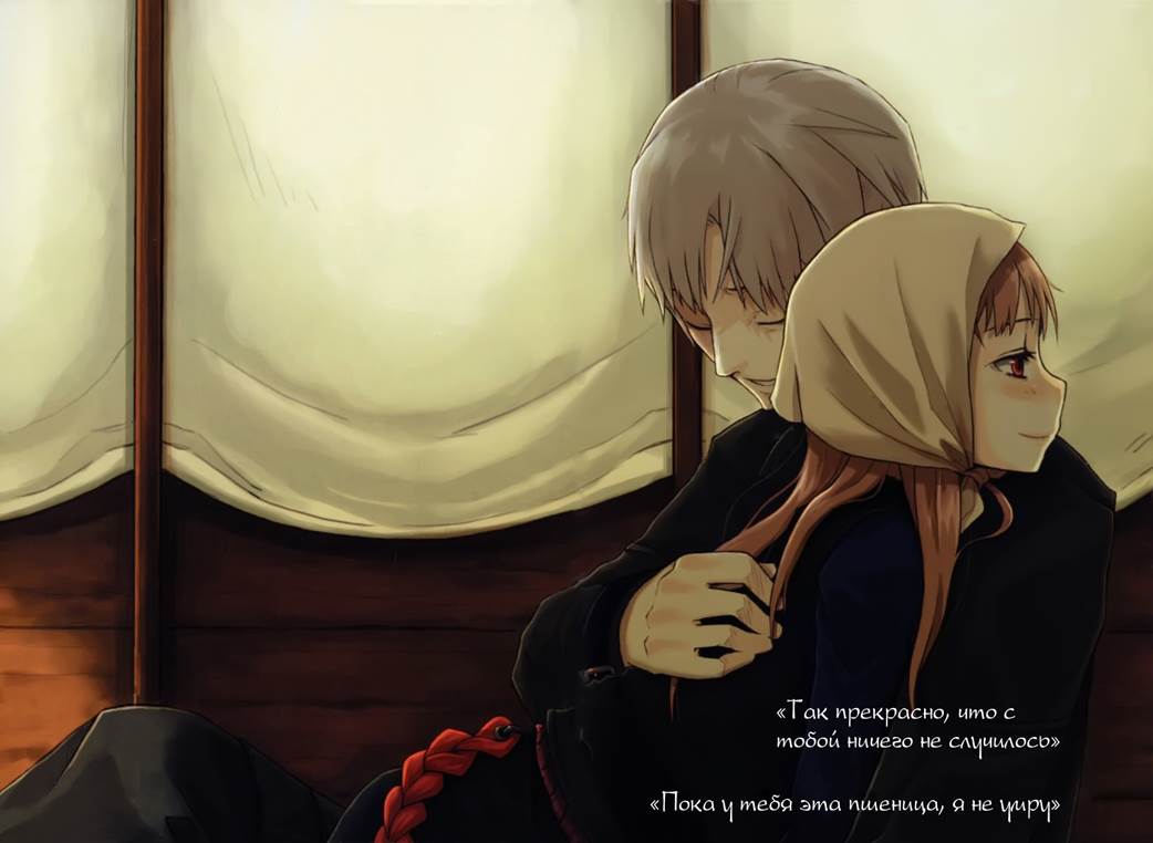 «Какие у нее длинные ресницы». Та же мысль прыгнула ему в голову снова. – Я же говорила тебе, я хотела, чтобы ты меня спас. Лоуренс немедленно кивнул. – Я… я была совершенно уверена, что спасать меня придешь ты… пфф… при одном воспоминании меня просто разрывает от злости! Внезапно Лоуренс словно пробудился ото сна. – Ты же мужчина, значит, ты должен был хотя бы появиться на поле боя! Все из-за тебя, это только из-за тебя я так опозорилась… – Но сейчас с тобой все хорошо, верно? – перебил Лоуренс, прежде чем Хоро завершила свою тираду. Хоро с крайне недовольным видом закусила губу и отвернулась. Помявшись немного, Хоро кивнула с таким тоскливым видом, словно только что выпила что-то горькое. Возможно, тогда у нее были завязаны глаза, подумал Лоуренс. Возможно, Хоро приняла за него, Лоуренса, пришедших за ней работников Гильдии Милона и сказала им что-то, что могла сказать только ему. За эти-то слова Хоро и была так рассержена, считая, что они ее опозорили. При этой мысли Лоуренс приободрился. Он был уверен, что если бы туда к Хоро зашел он, то наверняка увидел бы у нее то выражение лица, о котором мечтал. Он медленно взял Хоро за хрупкие плечи, притянул к себе и чуть-чуть прижал. Сперва Хоро упрямилась и пыталась противиться, но в конце концов сдалась. Несмотря на закрывавший ее голову платок, Лоуренс видел, как ее уши, только что стоявшие торчком, постепенно обвисли. Выражение гнева на ее лице сменилось на по-прежнему раздраженное, но видно было, что она сердится уже не всерьез. Обойди Лоуренс весь мир, скопи он много денег – все равно он не смог бы добыть то, что было сейчас прямо перед ним. – Это же так прекрасно, что с тобой ничего не случилось. После этих слов Лоуренса сердитые глаза Хоро медленно скрылись за веками. Наконец Хоро кивнула, лишь слегка недовольно поджав губы. – Пока у тебя эта пшеница, я не умру, – сказала Хоро, ткнув пальцем в нагрудную суму Лоуренса. Оттолкнуть руки Лоуренса, по-прежнему держащие ее за плечи, она не пыталась. – Для девушки есть пытка, столь же жестокая, как смерть. Лоуренс потянул Хоро за руки, и она медленно прильнула к нему, положив подбородок ему на плечо. Лоуренс ощущал ее стройное тело; оно казалось лишь немногим тяжелей сумы с пшеницей. Вдруг Хоро с озорной ноткой в голосе заявила: – Хех. Я такая привлекательная, что в меня даже человеческие самцы влюбляются. Однако не было еще самца, достойного быть моим партнером. Хоро высвободилась из объятий Лоуренса, и на лице ее вновь появилась ее прежняя нахальная улыбка. – Любому, кто попытается меня хоть пальцем тронуть, я скажу лишь: «Береги свою жизнь», – и кто бы он ни был, он будет бежать в страхе. Хе-хе-хех, – со смехом произнесла Хоро, и из-за ее вишнево-красных губ показались клыки. Услышав от Хоро такие слова, любой бы перепугался. – Однако есть и исключения. Внезапно улыбку Хоро как ветром сдуло, лицо ее стало совершенно безжизненным. Лоуренс почувствовал, что теперь это был не тот гнев, что раньше, – тихий гнев. – Угадай, кого я встретила среди тех людей, что меня схватили? Теперь выражение лица Хоро можно было описать лишь словом «ненависть». Клыки показались из-за губ еще больше. Лоуренс невольно выпустил ее тонкие запястья и спросил: – И кого же? «Интересно, кто мог так разозлить Хоро? Неужели кто-то, кого она знала раньше?» Лоуренс угадал. Хоро наморщила нос и выпл