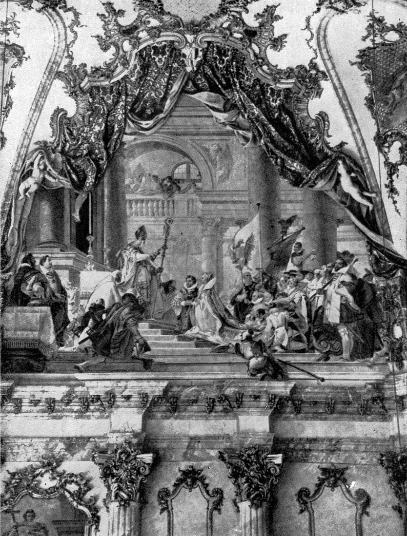 Над карнизом короткой стены зала, умело используя освещение, Тьеполо помещает фреску, изображающую бракосочетание Барбароссы. В сложной интерьерной композиции с мотивами в духе Веронезе он представляет многолюдную свадебную церемонию, написанную в звучных и радостных тонах — сине-голубых, малиновых, желтых, зеленых, серебристо-серых. Помимо этих фресок Тьеполо расписал огромный, около 650 кв. м, плафон над дворцовой лестницей, где изобразил Олимп. Нерасчлененную поверхность потолка он как бы «проломил» насквозь, превратив ее в безграничное небесное пространство. Поместив среди несущихся облаков Аполлона, он по карнизу вокруг стен изобразил олицетворения разных частей света — Европу в виде женщины, окруженной аллегорическими фигурами наук и искусств (отдельным персонажам придан портретный характер; среди них он изобразил самого себя, своего сына Джованни Доменико и помощников), Америку, Азию и Африку с изображениями животных и своеобразных архитектурных мотивов. Этот плафон — также одна из вершин декоративного искусства 18 века. По возвращении в Венецию Тьеполо, бывший в зените своей славы, становится президентом Венецианской Академии живописи и в течение двух лет руководит ее деятельностью. К лучшим созданиям декоративного гения Тьеполо относятся его фрески в Виченце в вилле Вальмарана, относящиеся к 1757 г., где художник работал с учениками и своим сыном Джованни Доменико Тьеполо (1727—1804). В росписях этой виллы, где Тьеполо обращается к новым декоративным решениям, его стиль приобретает особую утонченность и великолепие. Художник строит теперь свои композиции параллельно плоскости стены, возвращаясь снова к традициям Веронезе. Стенная плоскость превращается в античный перистиль, сквозь колонны которого открывается вид на прекрасный пейзаж. Большие пространственные паузы между фигурами, обилие света, белые, лимонно-желтые, бледно-розовые, нежно-фиолетовые, светло-коричневые, изумрудно-зеленые тона его палитры придают живописному ансамблю виллы Вальмарана ясный и радостный характер, проникнутый ярко жизненным ощущением образов античной и ренессансной поэзии. Во фресках главного зала виллы — так называемого Палаццо — запечатлены сцена, «Жертвоприношение Ифигении» и связанные с этим эпизоды. Три других зала были расписаны фресками на темы, заимствованные из «Илиады» Гомера, «Энеиды» Вергилия и поэм Возрождения—«Неистового Роланда» Ариосто и «Освобожденного Иерусалима» Торквато Тассо. Во всех этих сценах много движения, легкости, изящества и эмоциональности, подсказанной драматизмом литературных сюжетов, избранных Тьеполо.