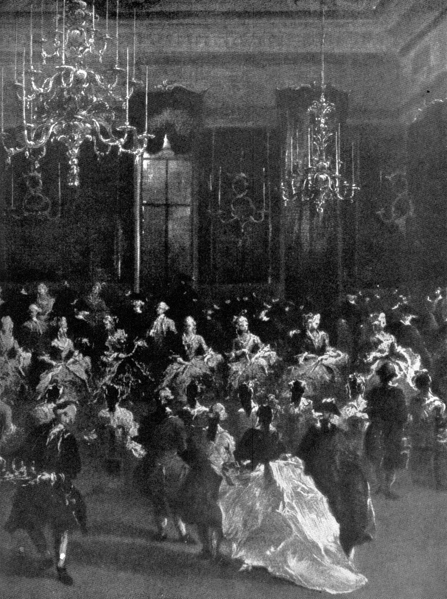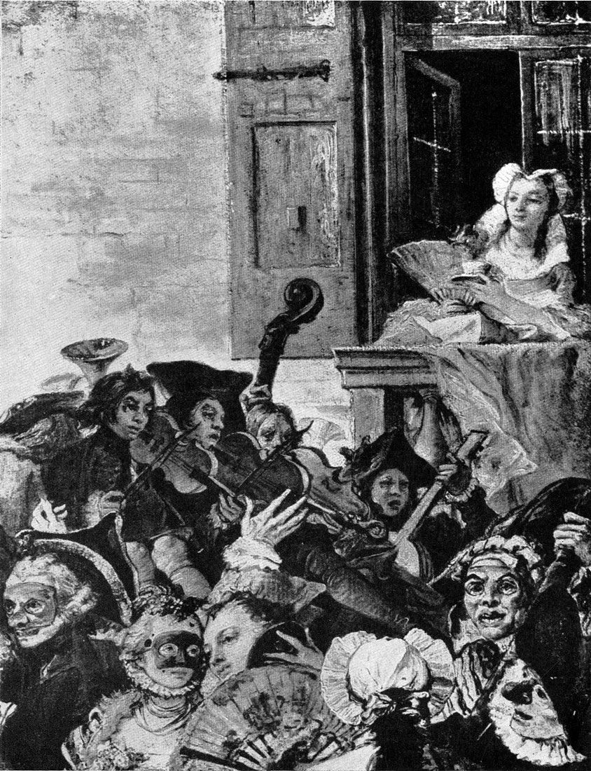 Для итальянской живописи 18 в. было характерно разделение ее по жанрам. Бытовой жанр, пейзаж, портрет получили в ней большое распространение, и художники специализировались каждый в своем виде искусства. Так, венецианский художник Пьетро Лонги (1702—1785) избрал своей специальностью изображение небольших галантных сцен, визитов, маскарадов, концертов, игорных домов, уроков танцев, народных развлечений, шарлатанов, редких зверей. Не всегда правильные по-рисунку, подчас довольно элементарные по колористическому решению, небольшие по размерам картины Лонги—«Урок танца» (Венеция, Академия), «За туалетом» (Венеция, палаццо Редзонико), «Носорог» (там же) — пользовались значительным успехом. Его повествовательная живопись, которую Гольдони называл сестрой своей музы, донесла до нас своеобразный и поэтический дух «века маски», беспечной уличной жизни, интриг, легкомыслия и развлечений, свойственный Венеции этого времени.