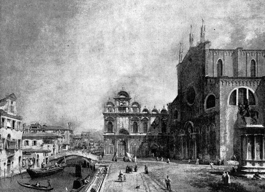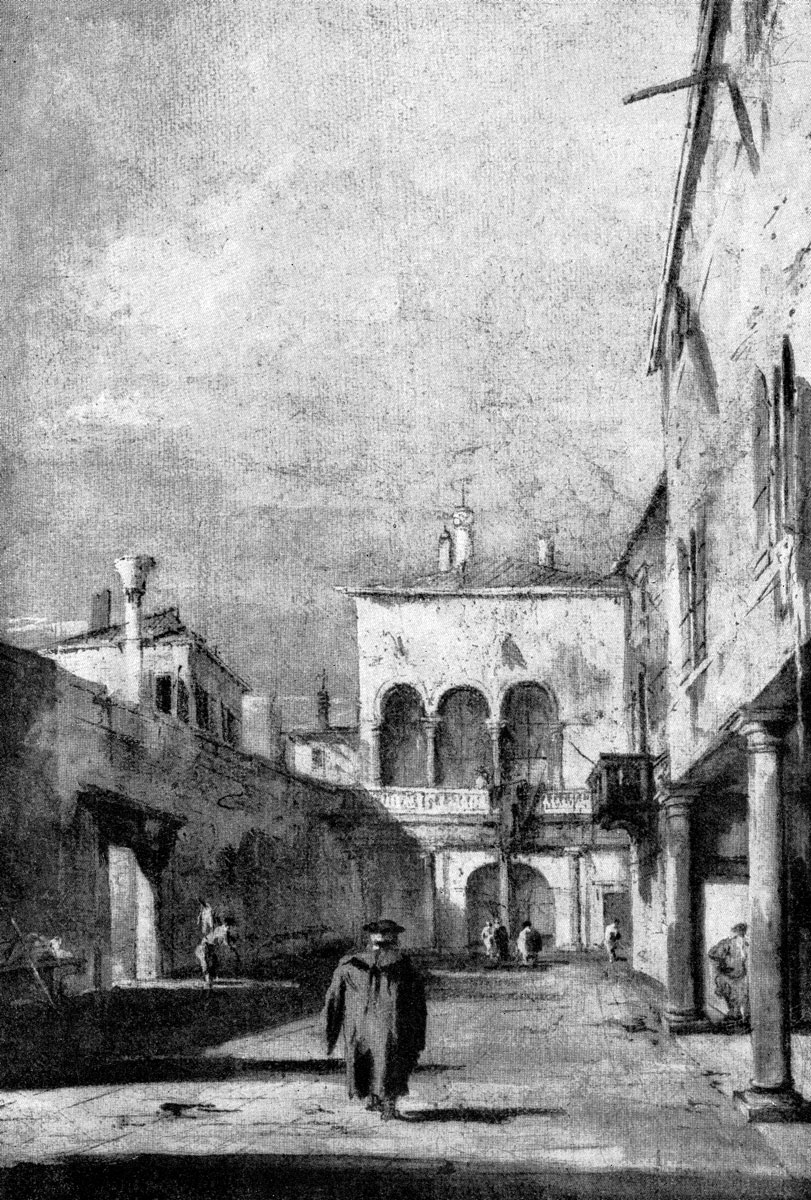 «Большой канал в Венеции» (Флоренция, Уффици), «Площадь перед церковью Сан Джованни э Паоло в Венеции» (Дрезден), «Двор каменотеса» (1729—1730; Лондон, Национальная галлерея) относятся к лучшим произведениям Каналетто. Из его картин, находящихся в советских музеях, следует назвать «Прием французского посольства в Венеции» (Эрмитаж) и «Отъезд дожа на обручение с Адриатическим морем» (Музей изобразительных искусств им. А. С. Пушкина). Приобретя широкую известность с 30-х гг. как художник, не знающий себе равных в своем жанре, Каналетто был приглашен в 1746 г. в Лондон, где по заказам английских меценатов написал ряд городских пейзажей, в которых его колорит, лишенный яркого и пластичного светотеневого освещения, утрачивает свою прежнюю звучность и разнообразие, становясь более притушенным и локальным. Таковы «Вид Уайтхолла», «Лондонское Сити под аркой Вестминстерского моста», «Праздник на Темзе» и ряд других. Кроме живописи Каналетто большое внимание уделял гравюре, которая между 1740—1750 гг. получила в Венеции блестящее развитие. Почти все венецианские пейзажисты — Марко Риччи, Лука Карлеварис, Каналетто, Беллотто — были крупными мастерами офорта. То, чего подчас не хватало большим полотнам Каналетто — движение, одухотворенность всей живописной ткани, — полностью выступило в его офортах, проникнутых настоящим поэтическим чувством. Используя в них мастерскую линеарную технику, добиваясь глубоких и мягких светотеневых переходов посредством тонкой параллельной штриховки различной интенсивности, Каналетто одновременно с этим заставлял «работать» бумагу, прерывая слегка волнистые горизонтальные штрихи легкими вертикалями либо оттеняя ими светлые места. И небеса, и плывущие на них облака, как бы подгоняемые легким бризом, и вода, и деревья оживают на его гравюрах. Быстрые и смелые контуры, беглые штрихи придают жизненную подлинность и реальность его «Порту в Доло»— небольшой площади на берегу водного бассейна, по которой движется молодая пара — кавалер в парике и камзоле, ведущий под руку даму в пышном туалете, невольно вызывающая в памяти зрителя романтические образы Манон Леско и кавалера де Грие из повести аббата Прево. Бернардо Беллотто (1720—1780) — племянник и ученик Каналетто — был также одним из выдающихся ведутистов 18 века. Четкое перспективное распределение планов, чрезвычайно большая, почти фотографическая точность в воспроизведении натуры, несколько заглаженная поверхность его картин придают им некоторую безжизненность, вызванную до известной степени тем, что Беллотто широко пользовался в своих работах отражениями камеры-обскуры. Его городские ведуты не отличаются широтой художественного обобщения, в них мало настроения, движения, воздушности, но они представляют большую художественно-документальную ценность. Помимо Италии он с 1746 по 1766 г. работал при дворах в Вене и Дрездене, а с 1768 г. был придворным живописцем в Польше, где создал множество видов Варшавы. По тщательности изображенных деталей можно предполагать, что эти ведуты дают более или менее верное представление об архитектуре, городском пейзаже и быте того времени. Венецианская живопись сеттеченто блеснула еще одним именем — Франческо Гварди (1712—1793), прекрасного художника, донесшего великие колористические традиции венецианской живописи почти до 19 ве