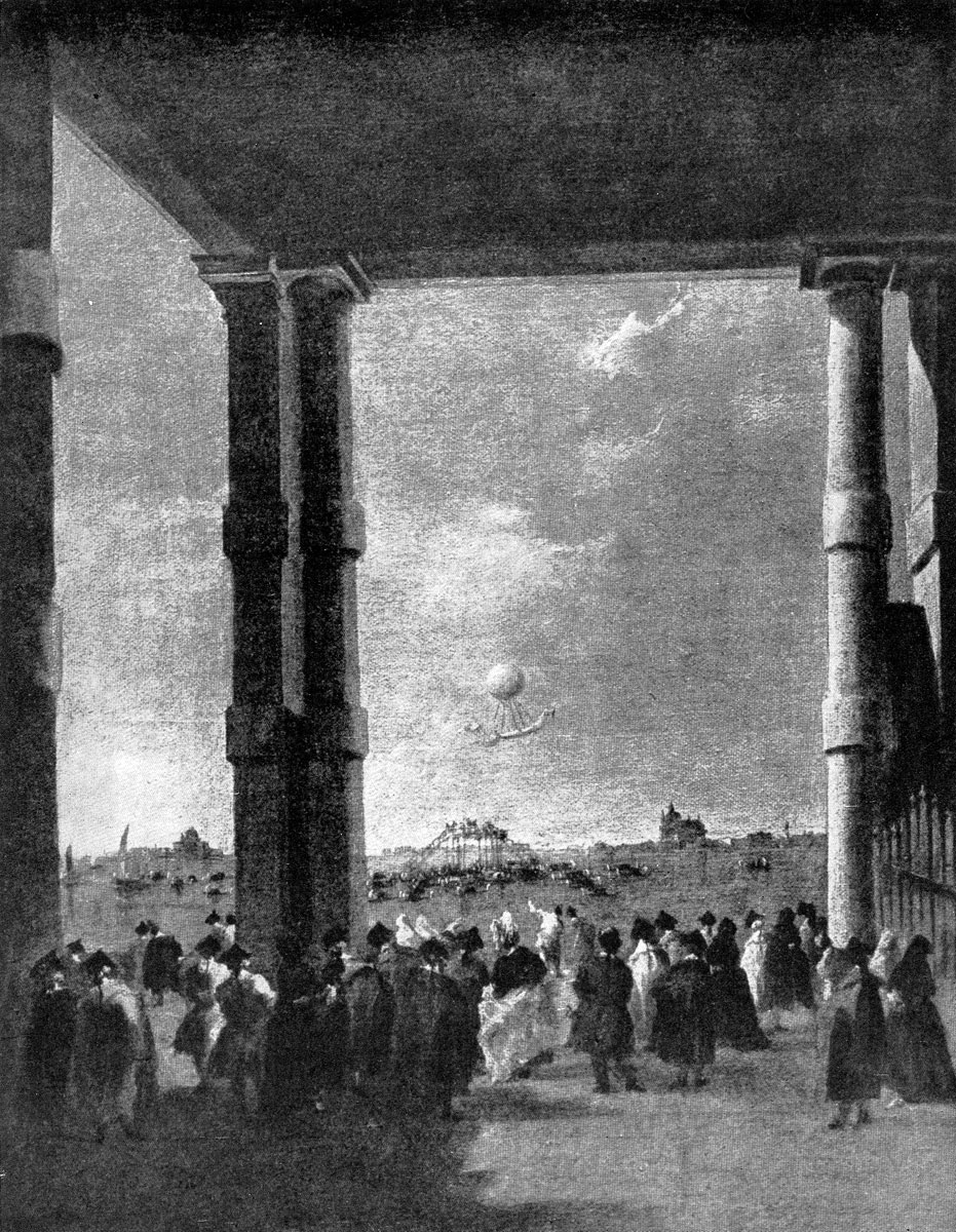 В 1784 г. Гварди, выполняя официальный заказ прокуратора республики, пишет картину «Подъем воздушного шара в Венеции» (Берлин), изображающую событие, необычайное для того времени. Используя привычный мотив, Гварди помещает на первом плане затененный каменный навес, под которым толпятся любопытные зрители, а в обрамлении колонн виднеется розовеющее облачное небо с качающимся воздушным шаром.
