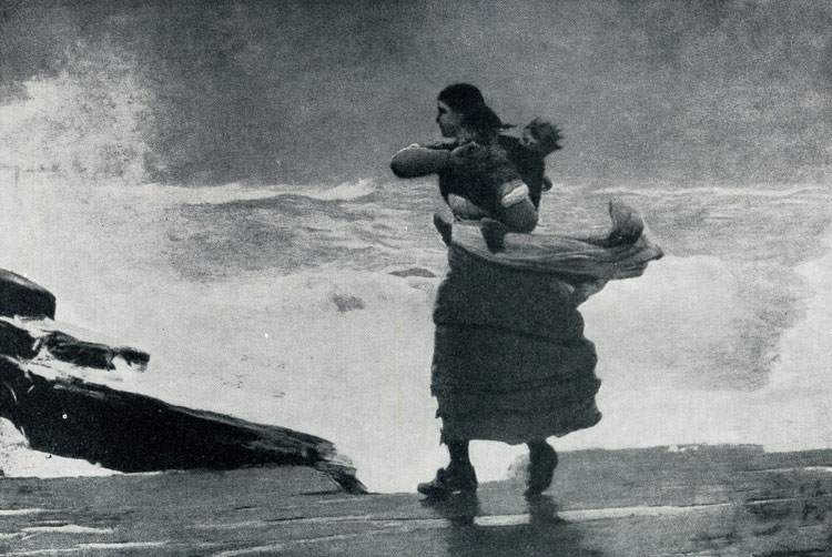 илл. 372 Поездка Хомера в 1885 г. на Багамские острова и его жизнь и работа среди дикой северной природы в штате Мэн и в Адирондакских горах, соприкосновение с прекрасной и суровой природой и людьми укрепило строгую простоту его мастерства. В 90-е гг. реалистическое искусство Хомера расцвело с новой силой, достигнув своей зрелости. Оно становится резче, смелее, внешне грубее, но внутренне собраннее и строже. В искусстве 19 в. не так уж много художественных образов человеческого труда, которые были бы полны такой внутренней значительности и поэтической силы. Как и в начале своего пути, Хомер неизменно строил произведения на контрасте близко и пристально увиденных человеческих характеров на первом плане, с далеким простором природы — леса или моря («Буря»; «Рам Кэй»). Это возвеличение человека было самым глубоким и сильным убеждением Хомера, сближающим его искусство с поэзией Уитмена. Действительно, можно легко представить себе, что Хомер вдохновился уитменовской «Песней с большой дороги», когда писал своего «Лесоруба» (1891; США, частное собрание) — крепкого, стройного молодого человека, задумчиво стоящего на вершине горы, опираясь на свой длинный топор, на фоне широчайшей дали покрытых лесом пологих гор. Молчаливый диалог человека с природой в своем роде здесь не менее многозначителен, чем пламенная ораторская речь поэта.