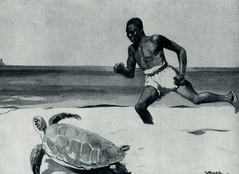 илл. 375 Путем действительно прогрессивным шло реалистическое искусство, одинаково чуждое и фальши официального «салонного» искусства и уводящим от жизни иллюзиям визионеров-романтиков. Чтобы идти по этому пути, нужно было глубоко верить в жизнь и в силу прогрессивных гуманистических идей. Реалистические мастера второй половины 19 в. были людьми различных философских и политических убеждений, но их объединяли общая борьба против идейной реакции и косности, сознательный или невольный протест против сложившейся неприглядной обстановки в духовной жизни США того времени. Этот протест иногда выражался в том, что художники, обладавшие нередко большим дарованием, навсегда покидали Америку, ища в других странах более благоприятные условия для творческого роста. Так поступили Уистлер, Сарджент, Мэри Кэссет. В таком разрыве с родиной заключалась, конечно, большая опасность утраты национального лица, и именно так происходило в тех случаях, когда художники не имели достаточно большого таланта и убежденности. Да и для больших художников этот разрыв не проходил даром. Другая, более трудная и в то же время более плодотворная форма протеста против мещанской цивилизации и ее уродливых порождений заключалась в самозабвенной работе над развитием реалистических принципов у себя дома, в Америке, и именно в таких случаях получались наиболее полноценные результаты. Так поступили Хомер и Икинс, в творчестве которых нашли выражение самобытные творческие устремления американского народа. Наиболее значительным и глубоким мастером американского реализма 19 в. был Уинслоу Хомер (1836—1910). С его появлением искусство США вторично — со времен Г. Стюарта — приобрело значение большой национальной школы, достойной занять место в ряду лучших национальных художественных школ своего времени. Следует, впрочем, заметить, что о нем почти ничего не знали в Европе даже в конце его долгой жизни, а в самой Америке его в те времена ценили по достоинству лишь немногие друзья или люди передовых и независимых взглядов. Правда, и он никогда не скрывал своего резко отрицательного отношения к господствующим буржуазным порядкам и вкусам. Хомер родился в Бостоне; он был, по существу, самоучкой и не получил систематического художественного образования, если не считать того, что он усвоил в юношеском возрасте ремесло литографа и в 1859—1861 гг. посещал вечернюю школу при Национальной Академии художеств в Нью-Йорке. С 1857 г. он начал делать рисунки на бытовые темы для еженедельных журналов. Гражданскую войну 1861—1865 гг. он провел в качестве военного художника, посылая в «Харперс уикли» рисунки со сценами сражений и лагерной жизни. В 1865 г. Хомер был избран членом Национальной Академии художеств. Широкую известность создала ему картина «Пленные с фронта» (Нью-Йорк, Метрополитен-музей), написанная в 1866 г., уже по окончании гражданской войны. Хомер сумел верно отразить настроения народа, прекрасно передав и гордое чувство победы в красивой и благородной фигуре молодого офицера армии северян, и снисходительную, хотя и немного презрительную жалость к тому разношерстному сброду, из которого вербовалась армия мятежников — южан. Своим крепким уверенным реализмом эта картина резко разрывала с сентиментальной и нарядной условностью тогдашней американской живописи. Она перерастала г