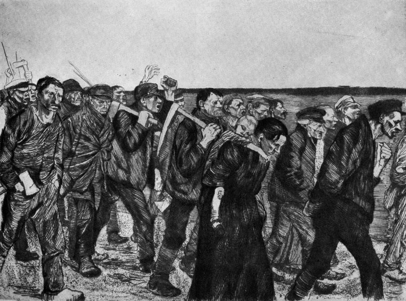 илл. 118 Второй монументальной работой Кольвиц явился цикл офортов, посвященный Великой крестьянской войне 1525 г., по выражению Энгельса, «самому фундаментальному событию германской истории». Художница работала над этой серией почти семь лет (1903—1908), изучала исторические источники (в частности, исследование В. Циммермана, использованное Энгельсом в его книге «Крестьянская война в Германии»), меняла детали и варианты целого, совершенствовала и усложняла технические приемы. И эти большие листы стали одной из вершин европейской графики 20 в.— столько душевного огня, столько жизненных наблюдений и высокого мастерства вложила в них художница немецкого пролетариата. Листы эти следующие: «Пахари» (1906), «Изнасилованная» (1907), «Отточка косы» (1905), «Вооруженная толпа» (1906), «Прорыв» (1903), «Поле битвы» (1907), «Узники» (1908). В каждой из этих гравюр Кольвиц стремится к повышенной выразительности, экспрессивности образа. Кольвиц, избегая «археологической» мелочной точности в изображении костюмов и обстановки, с огромной силой передает дух сурового трагизма этой исторической эпохи. Так, в первом листе («Пахари») люди пашут на себе; похожие на животных, они, почти распластавшись над землей в своем усилии, тянут плуг по истощенной земле. Вспоминается описание Ла Брюйером ужасающих условий существования крестьян в феодальную эпоху. Но зреет гнев. И в косом взгляде суровой женщины, оттачивающей косу для того, чтобы превратить орудие труда в оружие восстания, зритель глаз в глаз видит душу бунта. Самым сильным листом серии является «Прорыв», изображающий устремившуюся в бой толпу восставших крестьян, с женщиной на первом плане, воздымающей к небу свои иссушенные руки с призывом к беспощадной войне. В ней видели образ той «Черной Анны», которая, по историческим свидетельствам, боролась в отрядах «Башмака». Неудержимая стремительность лавины бегущих на врага крестьян передана с покоряющей силой. Между прочим, нельзя не усмотреть в этой композиции некоторой связи с композицией из «Восстания ткачей», сделанной Кольвиц несколькими годами раньше.