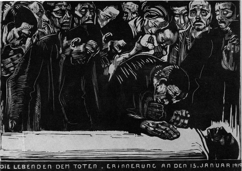 илл. 119 В 1901 г. Кольвиц создала темпераментную композицию «Карманьола», изображающую женщин революции, пляшущих вокруг гильотины. Гравюра «Карманьола» была, по-видимому, связана с впечатлением, которое произвела на художницу «Повесть о двух городах» Диккенса. (Название гравюры идет от возникшей в 1792 г. боевой революционной песни, созданной при взятии города Карманьолы. Куплеты кончались припевом: «Станцуем Карманьолу под грохот пушек!») Гравюра выполнена в очень сложной технике (офорт и акватинта), фигуры подчинены задаче воссоздания единого динамичного целого. Глубоко волнующей является также композиция «Поле битвы». По темному ночному полю бродит женщина; вот ее темная фигура, еще более темная, чем мрак ночи, склонилась над убитым. Фонарь освещает только его лицо и протянутую к нему руку женщины; и это рассказывает все—и горе женщины и трагедию борьбы. Творчество Кете Кольвиц в последующие десятилетия прошло еще длинный и многотрудный путь. Ее большое сердце глубоко переживало трагические этапы жизни ее родины, а также всего рабочего движения, в частности и освободительной борьбы Советской страны. Когда руки империалистических интервентов потянулись к рубежам страны социализма, рабочие многих стран — Англии, Франции, Германии — возносили свой голос протеста забастовками, демонстрациями, отказом в перевозке грузов препятствуя осуществлению замыслов задушить колыбель социалистической революции. Кете Кольвиц приняла участие в этой борьбе. В годы голода в Поволжье в 1921 г. художница создала волнующий плакат «Помогите России». В 1931 г. она выпустила литографский плакат «Мы защищаем Советский Союз»: цепь рабочих, взявшихся за руки, стоит нерушимой ограждающей стеной; среди рабочих и женская фигура; повторный ритм сцепленных рук создает впечатление, что перед нами часть продолжающейся в обе стороны боевой шеренги. В 1927 г. Кольвиц посетила Советский Союз, где дружески встретилась с художниками революционной России (АХРР). Поиски экспрессивного, заостренного стиля, стремление к монументальности формы всегда глубоко волновали К. Кольвиц, которая, однако, в поисках новой формы постоянно исходила из содержания — гуманной цели своего творчества. В ряде работ она ищет лаконически-обобщенный язык, доводя графические решения до сопоставления больших резко очерченных пятен белого и черного (гравюры на дереве из серии «Матери» и «Войны»). В 1919—1920 гг., потрясенная убийством Карла Либкнехта, она зарисовывает его в морге, а затем в ряде вариантов сцены прощания рабочих с революционным вождем (литографии и гравюры на дереве) создает не только памятник ушедшему, но и призыв к оставшимся, к единству и продолжению борьбы.