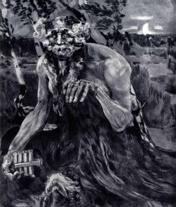 илл. 22 В этом отношении симптоматично тяготение мастера к сказочным образам, созданным силой фантазии, умение уловить в красках, на холсте их чудесную жизнь и заставить поверить в нее зрителя. Поистине поэтична в своей сказочной красоте «Царевна-Лебедь» (1900; ГТГ), навеянная оперой Римского-Корсакова «Сказка о царе Салтане», — воплощение женственной нежности, чистоты, печали и манящей таинственности. Ощущение необычайности создает и «волшебный» врубелевский колорит с перламутровыми переливами в одеянии царевны и «горящими» красками вечерней зари в пейзаже. Фантастика и поэзия русской народной сказки, проникновенный, утонченный лиризм современной Врубелю поэзии, музыки Римского-Корсакова, глубокие впечатления от красоты родной природы слились воедино в этом образе, как и в образе мудрого «Пана» (1899; ГТГ). Эти произведения тесно связывают Врубеля с народно-национальными традициями русской художественной культуры, многогранно отраженными и переработанными современными ему живописью, театром, музыкой. Для художника, столь впечатлительного к образам искусства, здесь раскрывался богатейший эмоционально-поэтический мир, по его словам, «музыка цельного человека». Они же дали жизнь ряду его других замечательных работ — майоликовым декоративным скульптурам («Весна», «Мизгирь», «Купава» и др.)» исполненным по мотивам оперы Римского-Корсакова «Снегурочка».