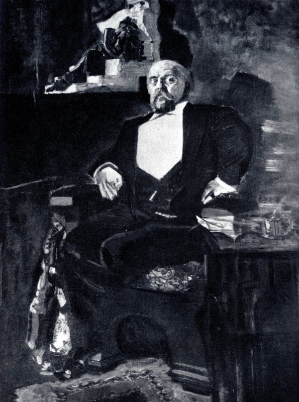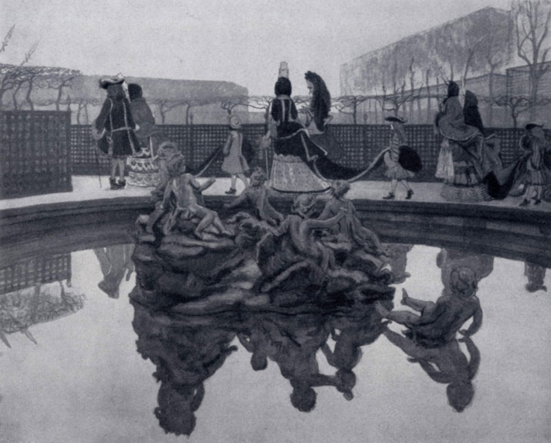 илл. между стр. 64 и 65 Отражая эпоху, многие портреты и картины Врубеля несут в себе ощущение скрытого неблагополучия, растущей духовной драмы, конфликта с жизнью. Эти настроения сгущаются в таких произведениях, как «Гадалка» (1895; ГТГ) и «Демон (сидящий)» (1890; ГТГ), но особенно в одной из самых знаменитых картин — (Демоне поверженном», где с болезненной остротой передана трагедия индивидуализма, трагедия одиночества, отчужденности и крушения всех гордых упований и в то жо время непокорная, протестующая сила духа. В «Демоне поверженном» (1902; ГТГ) художник добивался все большей Эмоциональной экспрессии, по многу раз переписывал лицо и фигуру, стремясь сочетать непокорную силу духа и силу страдания, сталкивающиеся в непримиримом противоречии. Многое в замысле этой картины раскрывает колорит: сгущающийся синий сумрак, среди которого неясно сверкает павлинье оперенье крыльев и чуть брезжут розоватые отсветы зари. Ныне несколько померкнувший, по свидетельству современников, этот колорит особенно поражал своей невиданной красотой и эмоциональностью. Образ поэмы Лермонтова здесь послужил Врубелю как бы символом, заключающим в себе уже иное содержание, созвучное драматическим переживаниям русской интеллигенции начала 20 в. Не случайно на это произведение Врубеля откликнулся Александр Блок. Индивидуалистические настроения, отчасти получившие выражение в творчестве Врубеля, с еще большей определенностью сказались в декларациях объединения «Мир искусства». Выражая эти тенденции, С. П. Дягилев писал: «Мы любим все, но видим все через себя», подчеркивая тем самым субъективизм во взглядах, оценках, вкусах. Однако, вопреки субъективистским и декадентским взглядам, влияние «Мира искусства» проявилось плодотворно в театрально-декорационной живописи, в книжной и журнальной графике, в которых в то время нередко царили рутина и ремесленничество. Здесь мастера «Мира искусства» сумели вернуть забытые традиции и разрешить ряд важных художественных задач. А. Н. Бенуа, Л. С. Бакст, К. А. Сомов создали искусство утонченное, изощренное, искусство во многих своих проявлениях камерное, отмеченное печатью буржуазных индивидуалистических настроений, ретроспективизмом. Они сказались, например, в ряде станковых произведений Александра Николаевича Бенуа (1870 — 1960). Его излюбленной темой были Версаль и эпоха Людовика XIV. В сюите посвященных им картин и акварелей с легкой иронией А. Бенуа вспоминал о престарелом, пережившем свой век короле и его придворных, чьи гротескно трактованные фигурки «вкраплены» в природу Версальского парка и противопоставлены вечной красоте этой упорядоченной гением человека природной стихии. Таковы небольшого формата работы «У бассейна Цереры» (1897; ГТТ), «Прогулка короля» (1906; ГТГ), «Фантазия на версальскую тему» (1906; ГТГ) и др. Неторопливо повторяющиеся горизонтали подстриженных боскетов, ритм мраморных статуй, уходящих в перспективу выровненных аллей, зеркальная гладь бассейнов, отражающих как бы «наизнанку» все окружающее, — создают впечатление искусственного, театрализованного камерного мирка.