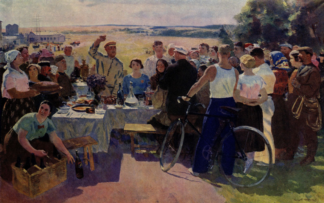 илл. между стр. 128 и 129 С. Герасимов работал в 20 — 30-х гг. и в области историко-революционной живописи (картины «Октябрь», «Клятва партизан»; Москва, Музей Советской Армии). Однако наиболее значительное его произведение — картина «Колхозный праздник» (1937; ГТГ). В этом полотне в полную силу проявился живописный талант мастера. Картина наполнена светом и воздухом и производит радостное, мажорное впечатление. Художник не задавался целью создать глубокие характеры людей. Главное, что ему хотелось, — это передать чувство праздничности, довольства, изобилия, которое стало определять жизнь деревенского коллектива. Впрочем, зритель живо ощущает, что перед ним люди 30-х гг., — настолько типична их внешность. И председатель колхоза, и сидящая около него девушка с орденом на груди, и колхозница, держащая в руках блюдо с пирогом, и парень с велосипедом — все эти современники Герасимова вошли в картину прямо из окружающей жизни. Прекрасный пейзажист, С. Герасимов показал колхозный пир на фоне раздольного среднерусского пейзажа. Это позволило ему проявить великолепное мастерство изображения фигур и предметов в пленэре.