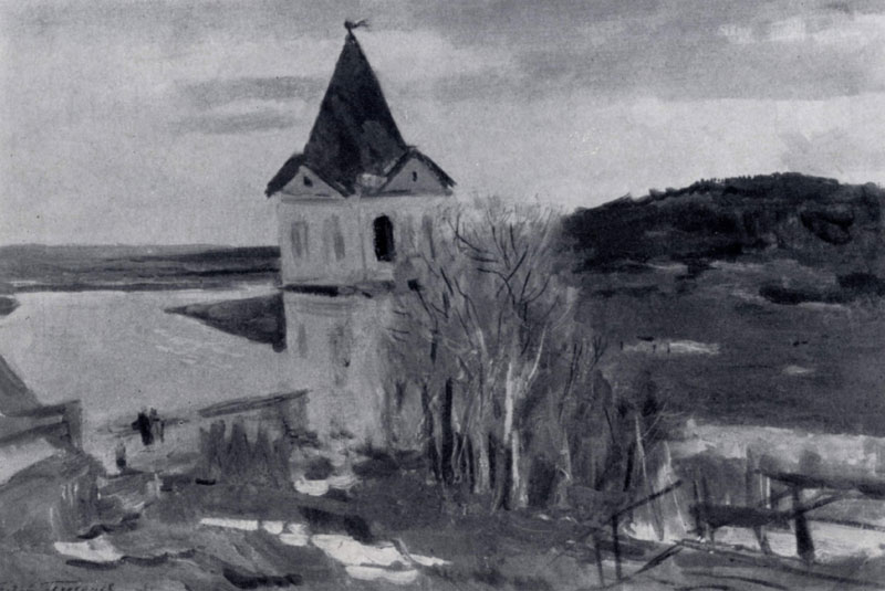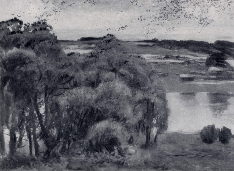 илл. 72 б В 30 — 50-х гг. в полную меру обнаружился талант С. Герасимова-пейзажиста. Серия можайских пейзажей художника — заметное явление советской живописи этих лет. В ней С. Герасимов проявил себя удивительно тонким поэтом русской природы, сумев как живописец по-новому увидеть и передать ее особенности. В картине «Ива цветет» (1950) природа в прозрачном весеннем уборе. Это полотно весьма характерно для манеры художника. Хотя рисунок играет здесь существенную роль, основным является колорит, построенный на сочетании легких прозрачных тонов, оживленных ударами небольшого числа интенсивных красочных пятен (голубизна неба, яркость первой зелени). В некоторых пейзажах С. Герасимов добивается интенсивного звучания цвета. Это относится к полотну «Лето» (1955), где природа предстает в пору зрелости, когда силы земли обнаруживают себя звучностью красок, когда драгоценностью кажется зелень лугов, густая синева рек, голубизна бездонного неба.