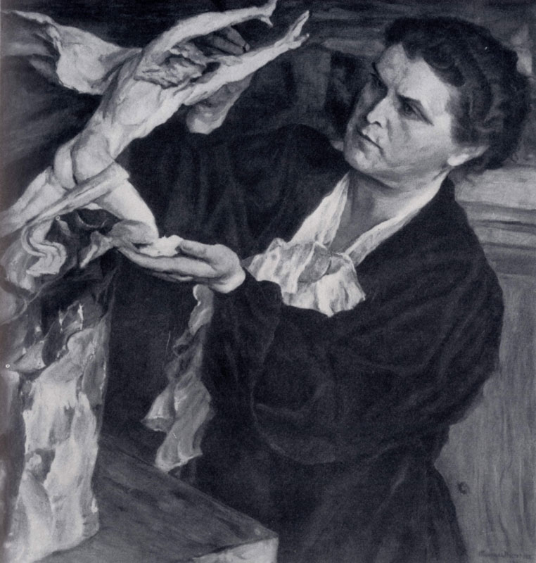 илл. 66 а Значительные успехи были достигнуты в 30-е гг. советскими портретистами. Образ деятельного, энергичного человека, человека богатого душевного мира и благородства — вот идеал, к которому стремились портретисты этого времени. С наибольшей глубиной этот идеал был воплощен в произведениях М. В. Нестерова. После революции Нестеров заново обрел себя как художник. Им создана галерея портретов советской интеллигенции, людей творческого труда, ученых, художников, артистов. Среди них хранящиеся в Третьяковской галлерее портреты братьев П. Д. и А. Д. Кориных (1930), С. С. Юдина (1935), И. Д. Шадра (1934), П. П. Павлова (1935), К. Г. Держинской (1937), Е. С. Кругликовой (1938), В. И. Мухиной (1940) и другие.