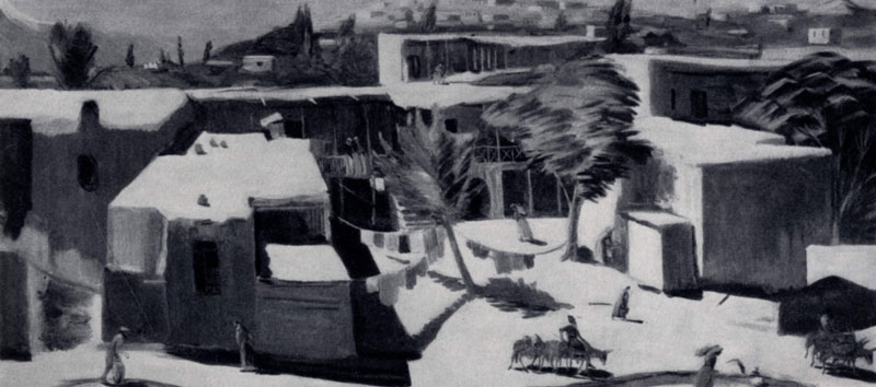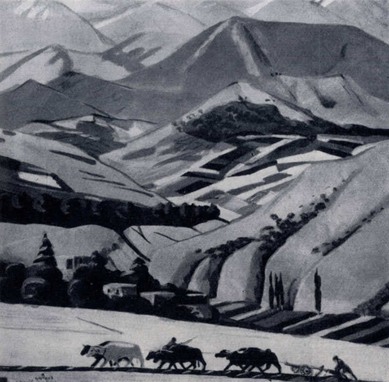 илл. 71 В 30 — 40-е гг. искусство Сарьяна обретает еще большую зрелость и цельность. Все больший интерес проявляет художник к образу человека. Отказываясь от второстепенных деталей, сосредоточивая внимание на наиболее впечатляющих индивидуальных особенностях модели, он добивается остроты передачи характера человека (портрет народного поэта Армении А. Исаакяна, 1940; Ереван, Картинная галлерея Армении). Оригинальным по форме и глубоким по концепции является «Автопортрет» Сарьяна (1942; Ереван, Картинная галлерея Армении). Новых успехов достигает художник в области пейзажа и натюрморта. С любовью изображает он залитые солнцем снежные вершины и утопающие в зелени долины Армении, особую прозрачность ее воздуха, древние сооружения и новостройки, прекрасно гармонирующие с окружающим ландшафтом («Южная зима», 1934, Москва, Музей искусства народов Востока; «Алавердский медеплавильный завод», 1935, Ереван, Картинная галлерея Армении; «Сбор винограда», 1937, Москва, Центральный музей музыкальной культуры им. М. И. Глинки, и другие). Великолепное чувство цвета и чуткость к декоративным возможностям колорита позволяют Сарьяну добиваться ярких художественных эффектов. Так, в натюрморте «Осенние цветы и фрукты» (1939; ГТГ) напряженное звучание ярких красок с большой силой передает красоту цветения и неиссякаемую щедрость природы.