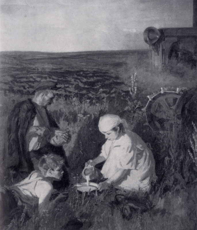 илл. 81 В ином плане написана Пластовым картина «Ужин трактористов» (1951). Здесь все дышит покоем. На землю спускаются сумерки, поле потемнело, и свет заходящего солнца окрасил все в красновато-золотистые тона. В высокой траве расположились на ужин тракторист и его подручный, которым принесла хлеб и молоко девочка в аккуратном белом халате. Главный герой картины — тракторист. Художник нисколько не приукрашивает его. На нем старая, потрепанная одежда, черты его усталого, обросшего щетиной лица не отличаются правильностью, но образ этого человека вызывает глубокую симпатию. Не случайно показал художник тракториста бережно режущим хлеб. Хлеб — плод его труда, и он относится к нему с чувством особого благоговения. Великолепно в смысле чисто живописном объединил художник всю группу. Фигуры людей озарены красноватым светом заходящего солнца, который сообщает колориту особую теплоту. Этот свет смягчает вспышки кирпично-красного, голубого, белого. Нетрудно заметить, что художник не случайно выделяет яркими пятнами девочку и паренька, тем самым противопоставляя трактористу молодых героев картины. Но в этом выделении нет противоречия. Изображенные люди воспринимаются в неразрывном единстве. В огромной степени ощущению этого единства способствует пейзаж, великолепно написанный художником.