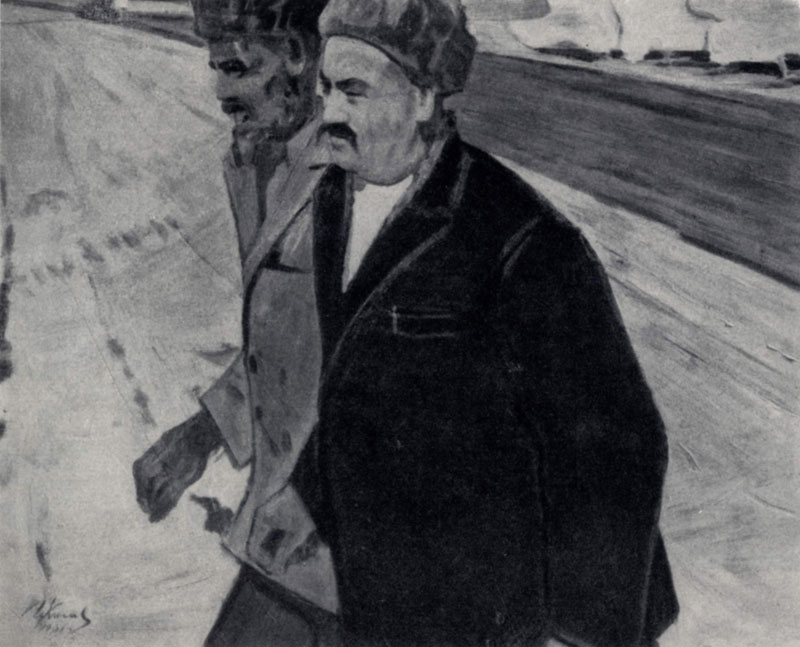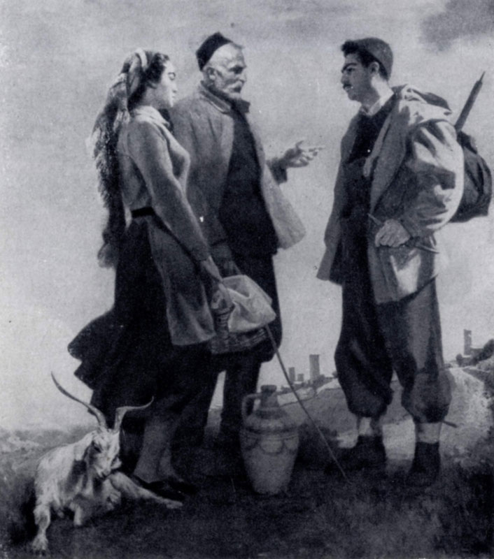 илл. 89 а Повествовательное начало присуще и картинам Ф. П. Решетникова (р. 1906). Но этот художник более склонен к подчеркнуто юмористической, хотя и очень сердечной характеристике действующих лиц. Эта черта свойственна получившим большую популярность картинам Решетникова «Прибыл на каникулы» (1948) и «Опять двойка» (1952; обе — в ГТГ). Последнее полотно весьма типично для жанровой живописи 40-х — начала 50-х гг. С любовью изображает художник «главного героя» картины — мальчугана, уже в который раз отдавшего конькам предпочтение перед школьными уроками; его мать, с отчаянием и любовью смотрящую на непутевого сына; сестру, укоризненно оглядывающую брата; самого младшего члена семьи, предвкушающего очередную взбучку старшему брату. Занимательная сценка, изображенная Решетниковым, лишена пустого анекдотизма. Своим отношением к людям художник утверждает мирную жизнь, уют домашнего очага, то здоровое, что определдет существование и помыслы советских людей. Впрочем, Решетников может быть и саркастически-гневным художником. Об этом говорит его триптих «Защитники абстракционизма» (1957), проникнутый сатирической злостью, бичующий шарлатанство, выдаваемое за последние откровения современного буржуазного искусства. Жанровые полотна советских художников свидетельствуют не только о тематическом богатстве живописи послевоенных лет. Важно то, что метод социалистического реализма открывает возможности многогранного раскрытия темы современности. Широта и многообразие поисков в жанровой живописи становятся особенно очевидными, когда обращаешься к искусству союзных республик, где общие для советского жанра проблемы решаются на разнообразном национальном материале. Грузинский живописец У. М. Джапаридзе (р. 1906) — мастер, создавший ряд интересных жанровых полотен, успешно работающий также в области портрета, историко-революционной картины, иллюстрации. Его небольшим холстам свойственно спокойно-величавое настроение. Образы людей, созданные этим художником, — колхозников и колхозниц, умудренных годами стариков, юношей и молодых женщин Советской Грузии — отличаются монументальным характером при очень внимательной и точной фиксации всех особенностей их внешнего облика. Таковы картины Джапаридзе «Думы матери» (1945; Тбилиси, Музей искусств Грузинской ССР), «Напутствие» (1957; США, частное собрание) и другие.