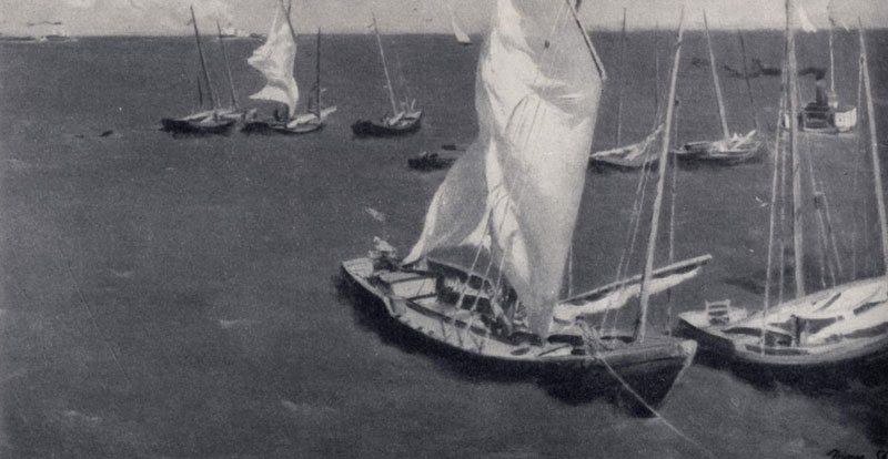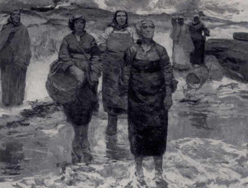 илл. 90 б Мужественностью образов близок Салахову латышский живописец Э. К. Илтнер (р. 1925). Но в его произведениях больше драматизма и раздумья. Такова картина «Мужья возвращаются» (1957). Жены рыбаков, встречающие своих мужей, полны тревожного ожидания. Художник не хочет ничего приукрашивать. Напротив, он словно говорит, что жизнь изображенных им людей полна суровых неожиданностей, что их труд требует мужества и самообладания.