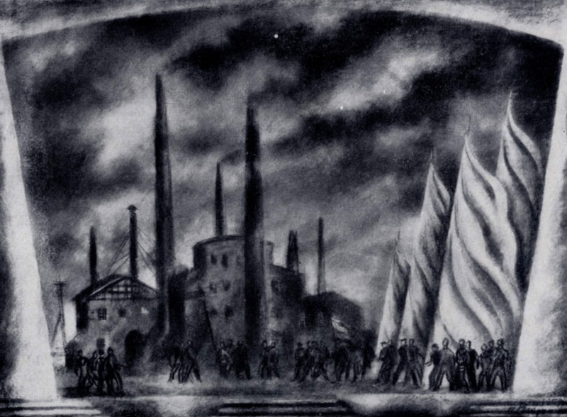 илл. 98 а Полным контрастом к творчеству Вильямса развивается самобытное дарование Ф. Ф. Федоровского. Стихийный темперамент, сочность живописного многоцветия палитры неизменно сопутствуют дальнейшей творческой биографии художника. Интересы Федоровского лежали в русле русской классической оперы. Масштабность замыслов, динамичность ракурсов и развитое чувство музыкальной выразительности цвета сообщали эпическое звучание его работам. Участие в постановке опер Н. А. Римского-Корсакова «Царская невеста» (ГАБТ, 1931) и «Псковитянка» (1932, там же) помогло художнику перейти к таким сложным монументальным произведениям, как «Князь Игорь» А. П. Бородина (1934 и 1944, там же) и сказочно-былинная опера «Садко» Н. А. Римского-Корсакова (1935 и 1949, там же). Эти оперы оставались постоянным источником вдохновения на протяжении всей его жизни. Особой патриотической силы и внутреннего подъема исполнены декорации Федоровского к «Тихому Дону» И. И. Дзержинского (1936, там же), декорации к «Ивану Сусанину» (ГАТОБ имени С. М. Кирова, 1939), в которых развернута картина народной эпопеи во всей мощи русского характера, оформление оперы П. И. Чайковского «Чародейка» (ГАБТ, 1943). Гигантская сила Мусоргского нашла в Федоровском художника, который сумел подчинить свою энергию и богатую фантазию характеру музыки. В декорациях к «Борису Годунову» (1946, там же) он стремился показать живую историю народа через сценическое воплощение образцов национальной архитектуры, особенности патриархального быта, подчинив их драматическому восприятию музыки. Так же монументален и целостен живописно-объемный принцип декораций к «Хованщине» (1948, там же). Общий живописный строй каждой картины создавал такую атмосферу действия, которая помогала слышать и как бы видеть величавую силу изумительных хоров оперы. Едва ли не лучшая картина в спектакле — «Стрелецкая слобода». По красоте и своеобразию композиции, убеждающей жизненности и мастерству исполнения это одно из выдающихся произведений художника. Работа над созданием современного монументально-героического спектакля составляет другую важную тенденцию в развитии советского театрально-декорационного искусства. Поиски в этом направлении прочно связаны с именем крупнейшего художника театра — Вадима Федоровича Рындина (р. 1902). Правда, в целом интересы художника очень разносторонни и широки. Они охватывают все виды и жанры драматургии, в том числе и музыкальной. Однако при тематическом разнообразии заметна особая привязанность художника к постановкам, насыщенным гражданственным пафосом и революционной романтикой. В то же время стилистическому богатству формальных приемов присущи некоторые общие черты. Это свойственная Рындину острота театральной формы, превосходное пространственное видение декораций на сцене, умение найти оригинальный принцип решения для всей постановки. Непреходящими в театральной жизни остались декорации Рындина к «Оптимистической трагедии» Вс. Вишневского (1933) в Камерном театре. Сжатость выражения мыслей, лаконичность изобразительного языка отличают единую динамическую установку в виде свернутой спирали, расходящейся ступенями от центра. Четкая по силуэту, пластичная по форме, она ассоциировалась то с палубой корабля, то с воронкой от разорвавшейся бомбы, то с виражем дороги как лейтмотивом всего