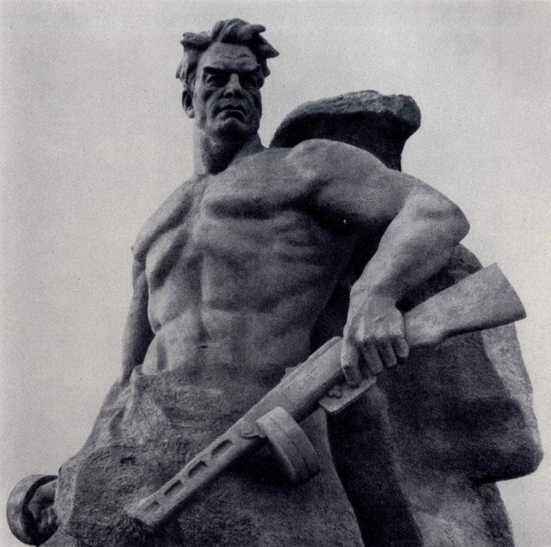 илл. 122 Грандиозные задачи встали перед Вучетичем при создании памятника воинам Советской Армии, павшим в боях с фашизмом на территории Германии. Он был сооружен совместно с архитектором Я. Б. Белопольским и художником А. А. Гор-пенко в Трептов-парке в Берлине (1949). Широта замысла повлекла за собой комплексное решение — включение архитектурно-планировочных средств, использование выразительности паркового ансамбля. Большая роль отведена скульптуре. Фигура скорбящей Матери-Родины помещена у входа, на пересечении боковой и центральной аллей. От нее широкая аллея-пандус, проходящая сквозь гранитные пилоны — знамена с фигурами коленопреклоненных воинов, подводит к братским могилам. Саркофаги с рельефами, изображающими эпизоды Великой Отечественной войны, обрамляют кладбище. По центральной оси ансамбль завершает монумент Воину-освободителю, возвышающийся на уступах белокаменного мавзолея. Скульптор нашел образ большого типического обобщения, в котором раскрылся смысл освободительной борьбы Советской Армии, свершившей свой гуманный подвиг во имя будущего человечества. Убедительно решен он в целом и в деталях. Светлое открытое лицо, статная фигура, сильные руки, одна из которых сжимает меч, а другая держит ребенка. Тесно переплетаются здесь элементы иносказания, аллегории с как бы подчеркнутой достоверностью факта. Не случайно этот образ заслужил всенародное признание и получил вторую жизнь в произведениях плаката, поэзии и кино. Символика, проявившаяся в берлинском памятнике, нашла развитие в последующих произведениях Вучетича.