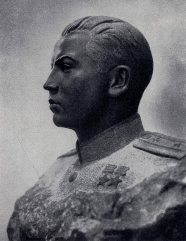 илл. 119 В новом качестве проявились эти черты в портретах героев Великой Отечественной войны. С большой жизненной полнотой, как-то особенно бережно и любовно передает скульптор черты воинов. Один из лучших портретов названного цикла — бюст дважды Героя Советского Союза майора А. С. Смирнова (1948; ГТГ). Тонко, почти филигранно высечены голова и плечи, четкие объемы которых контрастируют с едва обколотым мрамором основания. Уверенная и прямая посадка головы, ее четкий, «медальный» силуэт сразу же заявляют о внутренней собранности, непреклонной воле человека. Резкость черт мужественного, сурового, закаленного в боях лица смягчена тонкостью светотеневой моделировки. Тщательно проработанная пластика портрета как бы вбирает в себя все богатство живой формы, и от этого еще более конкретное, убедительное выражение получает то общее, что видит скульптор в лицах героев. Хорошо использованы свойства материала — черного базальта в портрете летчика М. Г. Гареева (1947; ГТГ).