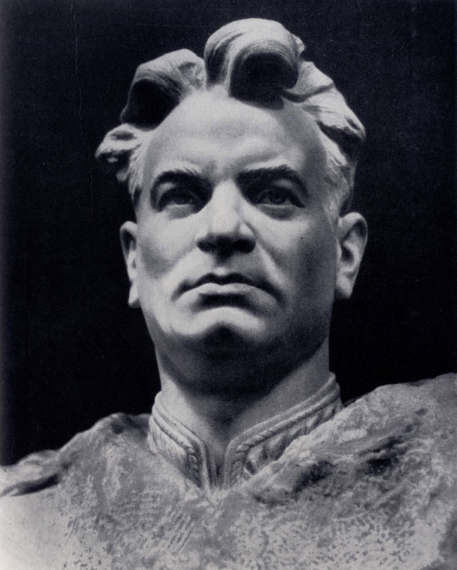 илл. 120 б В середине 50-х гг. Томский выступает с новым циклом портретов, в котором он, не оставляя работы над образом советского человека, обращается к изображению передовых деятелей, борцов за мир зарубежных стран. Тоньше становятся его характеристики, большее внимание уделяет он психологической выразительности. Пластическая форма портретов становится внутренне напряженной, способной выразить богатые оттенки духовной жизни человека (портрет Т. Залькална, бронза, 1956; портрет Жозефа Гельтона, бронза, 1954).