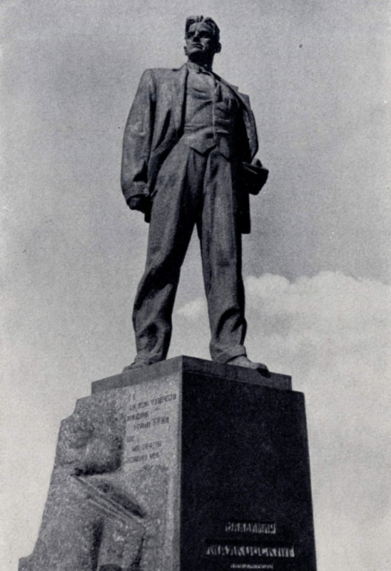 илл. 137 а В 1950 г. в Ереване, у подножия Канакерского плато, сооружается памятник армянскому писателю и просветителю 19 в. Хачатуру Абовяну по проекту скульптора С. Л. Степаняна (р. 1895). В 30-е гг. Степанян создал памятник выдающемуся революционеру Гукасу Гукасяну. Интересно сравнить эти два монумента. Если в предвоенной работе скульптор во многом шел от выразительности гранитного блока, подчеркивающего динамику заключенной в него фигуры, то теперь его занимает психологический рисунок образа, тонкость отделки статуи, чему способствует выбранный им материал — бронза. Из более поздних памятников, решенных в психологическом плане, можно назвать монумент А. С. Грибоедову в Тбилиси (1961) скульптора М. К. Мерабишвили (р. 1931), где в спокойно стоящей фигуре привлекают тонкое задумчивое лицо писателя и выразительные, нервные руки, сжимающие книгу.