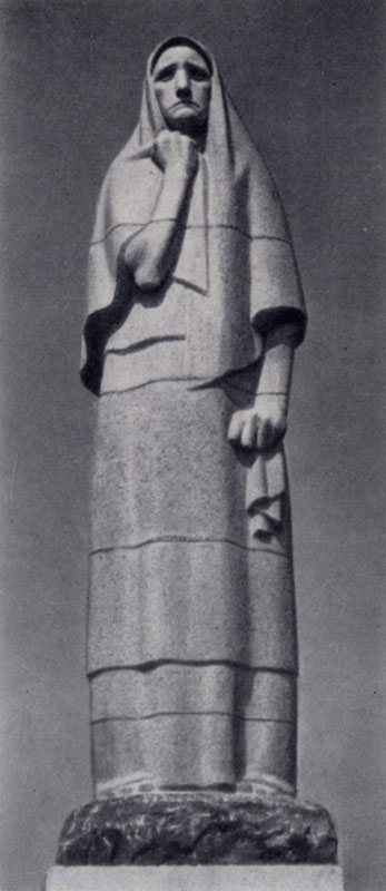 илл. 139 б Микенас был талантливым педагогом, воспитавшим целую плеяду молодых ваятелей и привившим им вкус и любовь к монументальному искусству. Среди них был Гедиминас Иокубонис (р. 1927), создавший выразительный памятник жертвам фашизма в Пирчюписе (1960, архитектор В. Габрюнас). Он установлен в Литве, в бывшем партизанском крае, на месте деревни, сожженной в войну фашистами. В нем можно видеть новаторское решение монументального ансамбля, сочетающего народные традиции с современными поисками. Главенствующую роль здесь играет скульптура. Обобщенно, лаконично решена фигура матери-литовки, поставленная на невысоком постаменте, неподалеку от шоссе. Внешне статичная композиция полна огромной внутренней экспрессии. В немой скорби застыла женщина. Наброшенная на голову шаль, длинное спадающее до земли платье помогают создать простой и выразительный силуэт, подчеркивающий монолитность скульптуры, сложенной из крупных каменных блоков. Особенно запоминается ее лицо, глубоко запавшие глаза, горестно сведенные брови, скорбно и сурово сжатый рот. Сила выраженного чувства подчеркнута и сдержанным жестом, как бы дважды повторенным. Скорбный и полный человеческого достоинства образ становится символом стойкости, величия души народа, который нельзя сломить никакими невзгодами. Выразительность скульптуры усиливается общим архитектурным решением монумента, его органической связью с окружающей природой. Контраст вертикали памятника и равнинной местности несколько смягчен низкой архитектурной стенкой, расположенной позади. На стене написаны имена всех погибших и врезан рельеф, очень тактично развивающий тему памятника. Иногда советские ваятели используют и более традиционные приемы, что сказывается в решении памятников деятелям культуры. Здесь необходимо учитывать и то, что многие из них возникли как завершение конкурсов, начатых еще в предвоенные годы. В 30-х гг. азербайджанский скульптор Ф. Абдурахманов (р. 1915) начал работать над памятником Низами, осуществление которого было прервано войной. В 1946 г. монумент устанавливают в Кировабаде, на родине поэта. При некоторой стилизации форм задрапированной в широкий плащ фигуры в нем привлекает жизненная и психологическая выразительность портрета Низами, естественность жеста. Интересны работы Абдурахманова и в станковой скульптуре (аЧабан», бронза, 1950; ГТГ).