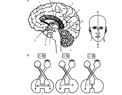 Б — поступление зрительной информации от каждого глаза в оба полушария в норме (а), нарушение взаимодействия полушарий после рассечения хиамы (б); прекращение взаимодействия полушарий после рассечения и других комиссур (в) з (по Д. Брэдшоу и Н. Нетлетону) Клинические наблюдения специфики нарушений психических функций при локальных поражениях левого и правого полушарий в последние годы подкрепляются и специальными исследованиями с использованием хирургических методов, направленных на «расщепление мозга», метода односторонней электрошоковой терапии, метода Вада (введение амитала натрия в одну из сонных артерий).