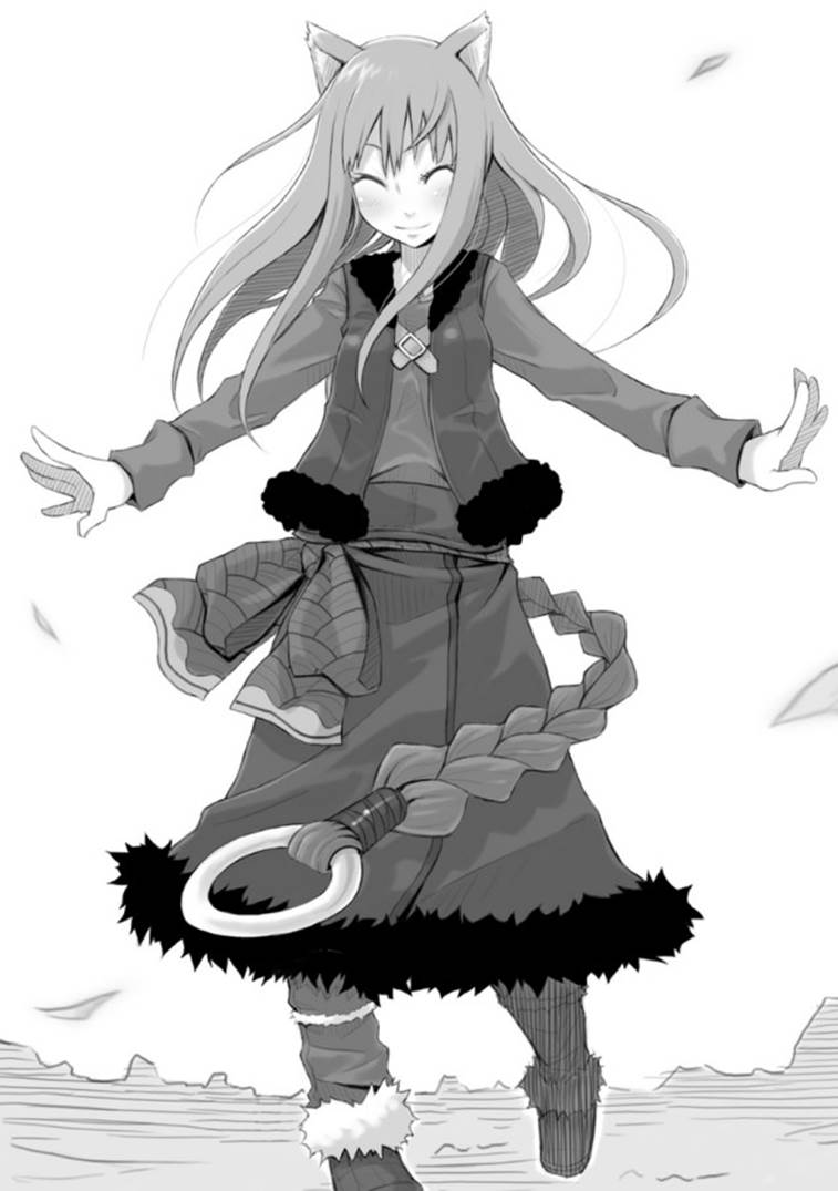 Лоуренс всегда был ранней пташкой. Если торговец хочет использовать все дневное время для зарабатывания денег, то он должен рано вставать. Но когда Лоуренс проснулся посреди утреннего тумана, Хоро уже давно была на ногах; она сидела возле него и с чем-то возилась. Хотя вчера Хоро сделала много чего, что удивляло Лоуренса, на этот раз ее нахальство перешло все границы. Осмотревшись, Лоуренс понял, что Хоро разворошила все его вещи и выбрала себе одежду; сейчас она завязывала на себе шнуровку. – Эй! Это моя одежда! Это, конечно, было не воровство, но все же шарить в чужих вещах, чтобы подобрать наряд для себя, – совсем не то, чем должна заниматься богиня. Лоуренс подпустил обвиняющую нотку в свой голос; но обернувшаяся к нему Хоро совершенно не выглядела виноватой. – Хм? Ты проснулся. Как это на мне смотрится? Мне идет? – спросила она, разведя руки в стороны и не обращая ни малейшего внимания на слова Лоуренса. Она не только не считала, что сделала что-то плохое, – она явно была довольна собой. При взгляде на нее Лоуренсу невольно показалось, что вчерашняя горячая и раздражительная Хоро была лишь сном. Возможно, сегодняшние бесцеремонность и властность были ее истинной натурой. Хоро была одета в лучшие одежды Лоуренса. Эти вещи он надевал всякий раз, когда собирался вести деловые переговоры с крупными городскими торговцами. Синяя куртка с длинными рукавами и в цвет ей модный жилет. Длинные узорчатые штаны из полотна и кожи, привязанные к поясу, и поверх пояса ремень из овечьей кожи. Сапоги из трех слоев дубленой кожи, такие толстые и крепкие, что ногам в них нипочем жгучие морозы заснеженных гор. И поверх всего этого – накидка из превосходно выделанной шкуры дикого медведя. Для бродячего торговца обладание практичным, удобным и вместе с тем благородным одеянием было поводом для гордости. Лоуренс начал откладывать деньги еще в ученичестве, и лишь десять лет спустя ему наконец-то удалось приобрести все эти вещи. Для ведения деловых переговоров ему требовалось лишь надеть эту одежду и слегка подправить бородку – и большинство партнеров относились к нему с уважением. И вот теперь столь важный для него наряд красовался на Хоро. Все-таки злиться Лоуренс не стал: в не по размеру большом одеянии Хоро выглядела невероятно милой. – Эта медвежья накидка очень хорошая, она отлично подходит к моим русым волосам. А вот в этих штанах моему хвосту неудобно. Можно я в них дырку проделаю? – небрежно поинтересовалась Хоро. Штаны эти были сделаны известным портным, сдавшимся под непрерывными мольбами Лоуренса. Если в них появится дыра, подумал Лоуренс, починить их будет уже невозможно. Поэтому он со всей решительностью покачал головой. – Ох. Ну хорошо, к счастью, они достаточно большие, я смогу их носить и так. Лоуренс поднялся на ноги, не отрывая глаз от Хоро. «Она ведет себя так, словно даже и не помышляет, что я могу приказать ей снять это все с себя, – думал он. – Раз так, едва ли она возьмет и сбежит вместе с одеждой». Если этот наряд отнести в город и продать, вероятно, за него удалось бы выручить изрядное количество золотых монет. – Ты, похоже, торговец с ног до головы. Я знаю, чего ты ожидаешь, – улыбнувшись, заявила Хоро и резво спрыгнула с повозки. Ее движение было столь естественным, что Лоуренс не успел среагировать. Он испугался, что Хоро именно сейчас во