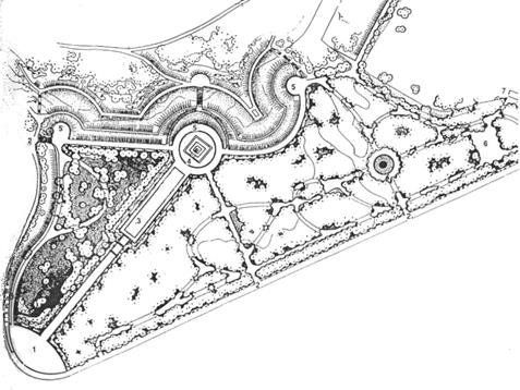 Рис. 11.3.11. Планировочная организация мемориального парка: 1 – главный вход; 2 – дополнительные входы; 3 – зона захоронений; 4 – обелиск с огнем Славы; 5 – видовые террасы; 6 - туалеты