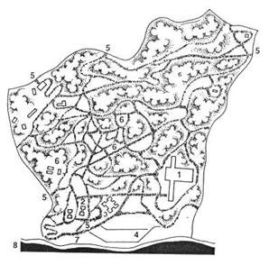 Рис. 11.3.12. Курортный парк в Ялте: 1 – гостиница «Ялта»; 2 – гостиница «Массандра»; 3 – кафе; 4 – автостоянки; 5 – входы в парк; 6 – основные композиционные узлы; 7 – приморская дорога; 8 - пляжная зона