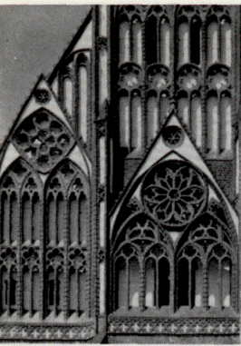 180 Церковь. Аллегорическая статуя северного портала собора в Страсбурге. Песчаник. 1230-е гг. мованных профилей. С применением кирпича видоизменилось взаимоотношение здания с окружающим пейзажем. Искусственность материала, к которой средневековье было достаточно чутким, противопоставляла здание природной среде. Мастера умели использовать этот контраст, с большим тактом вписывая красный цвет здания в зелено-голубые тона равнинного северного пейзажа. Переход к готической фазе в кирпичной архитектуре обозначился около середины XIII столетия и совпал с подъемом и дальнейшим расцветом северогерманских городов, объединившихся в Ганзейский союз. Расстановка и борьба общественных сил в городах Северной Германии наложили отпечаток на типы культовых сооружений. Во второй половине XIII века наметилось соперничество базиликального и зального храмов. Если базилика чаще торжествовала в городских соборах, то приходские и монастырские церкви строили главным образом зальными, тип которых благодаря слитности внутреннего пространства был ближе демократическому сознанию поднимавшихся городов и практике нищенствующих орденов. Зданием, обозначившим переход к зрелой готике в кирпичной архитектуре, была церковь Санкт Марией в Любеке (ФРГ), которой в 1270-е годы был придан вид трехнефной базилики. Строители были знакомы с архитектурой Суассона: как и во Франции, капеллы и хор имели единое сводчатое перекрытие. Но в кирпич- ном здании обозначилось желание строителей оперировать в первую очередь плоскостью стены, а архитектурные членения рассматривать как рисунок на ее поверхности. Храм в Любеке послужил примером для архитектуры городских соборов на севере Германии и в области между Эльбой и Одером. Более смелым экспериментаторским духом отличалась архитектура приходских и монастырских церквей. Здесь главное внимание было сосредоточено на взаимоотношении нефов и хора. Монастырская церковь в Корине (после 1273—1334 гг., ГДР) стала родоначальницей типа трехнефного храма с однонефным хором, который имел полигональное завершение. В Якобикирхе в Ростоке (ГДР) тип однонефного хора обогатился полигональным завершением боковых нефов. На подступах к поздней готике в кирпичном зодчестве Северной Германии был разработан зальный храм с трехапсидным завершением, хор при этом отсутствовал (Мариенкирхе в Пренцлау, ГДР; хор ок. 1325—1340 гг.). В Корине и Пренцлау значительна роль декоративных элементов в обработке фасадов. Тип позднеготической зальной постройки с обходом хора обозначился в Пазевальке (ГДР, середина XIV в.) и окончательно утвердился в кирпичной архитектуре около 1400 года. Среди церквей этого рода наиболее впечатляюща Катариненкирхе в Бранденбурге (ГДР). С 1395 года ее строил крупный архитектор Хинрих Брунсберг. В каменной архитектуре строители также сво-