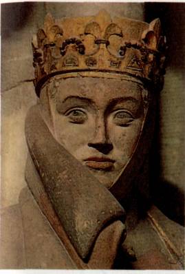 тельства здесь работали Парлеры, с 1392 года их сменили Ульрих из Эн-сингена и его сын, затем здание расширял Буркхарт Энгельберг, а в конце XV века завершил в основном Матеус Бёблингер. Начатый как зальная церковь, собор в ходе строительства приобрел форму базилики. Западный фасад его определяет высокая башня с ажурным шатром. В XIV и XV столетиях увеличился удельный вес светской архитектуры. Росло городское строительство, продолжалось возведение замков, строительство мостов. Среди городских построек возросла роль общественных зданий —ратуш, торговых домов, больниц, цейхгаузов, гостиниц. Рядовая застройка оставалась фахверковой, но строились и каменные дома («Нассауэр-хауз» в Нюрн- 183 Маркграфиня Ута. Статуя западного хора собора в Наумбурге. Деталь. Камень. Ок. 1250 г. берге, XIII—XIV вв.). В архитектуре скульптура пережила расцвет в