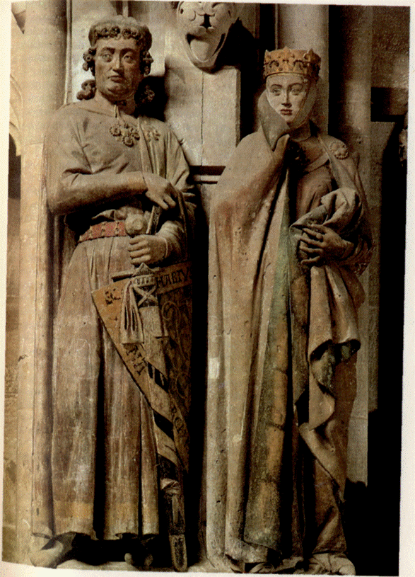 185 Всадник. Статуя собора в Бамберге. 186 Маркграф Эккехард и его жена У та. но сильной оказалась у бамбергских мастеров тяга к жанровому и характерному. Но у каждого из трех скульпторов она получила различный оттенок. Автор «Страшного суда» — рассказчик, который заостряет образы до гротеска. Скульптор «Адамовых врат» более сдержан, его влекут к себе значительные образы. Программа портала была связана с политическими и моральными проблемами эпохи. Появление изображений Генриха II и его жены Кунигунды в соседстве с апостолом Петром, Адамом и Евой не только прославляло основателей храма, но косвенно намекало на имперскую политику короля и роль епископа. Создатель «Адамовых врат» был крупной творческой личностью. Изображение обнаженных Адама я