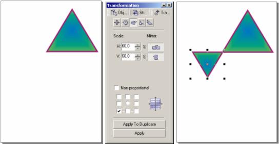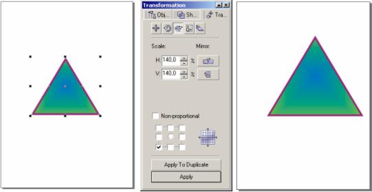 SCALE (Масштаб) Используется для изменения размера и зеркального отображения объекта. Счетчики H и V содержат коэффициенты растяжения или сжатия по горизонтали и вертикали. При этом изменения вертикального и горизонтального масштабов могут производиться независимо (если установлен флаг Non-proportional). Кнопки Mirror служат для зеркального отражения относительно горизонтальной и вертикальной осей. Маркерная сетка определяет точку привязки Изменить пропорционально размер фигуры, относительно ее левого нижнего угла.