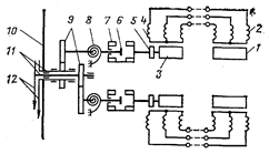 Рис. 2 Электрическая схема тахометра ИТЭ-1 1-ротор датчика-генератора; 2-статорная обмотка генератора; 3-ротор электродвигателя указателя; 4-статорная обмотка электродвигателя указателя; 5 - гистерезисный диск; 6 - диск указателя; 7 - магнит чувствительного элемента; 8-пружина-волосок; 9- зубчатая передача; 10-шкала прибора; 11- оси стрелок; 12 - стрелка
