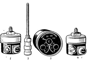 Рис. 3 Комплект трехстрелочного индикатора ЭМИ ЗК: 1-4 - датчики ИД; 2 - приемник П-1; 3 - указатель УИЗ t Основные данные: Диапазон измерения: - давление топлива.................................................. 0- 1 кГ/см2 - давление масла...................................................... 0- 15 кГ/см2 - температура масла............................................... 0-150°С Напряжение питания.............................................. 27 ±:2,7 В Температурный режим.......................................... от-60 до +50°С