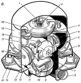 Рис. 3 Гироагрегат ГА 6:, а) - оси гироскопа гироагрегата ГА 6, б - конструкция гироагрегата ГА 6 б) 1,2 - коллекторы съема сигнала курса; 3-статор сельсина-датчика курса; 4 - устройство с точечными контактами (связь гиродвигателя с ЖМПП), 5, 11,20 - редукторы, 6-жидкостный переключатель потенциометр (ЖМПП), 7 - гиродвигатель 8- штепсельный разъем, 9-двигатель коррекции горизонтального положения оси А-X, 10-двигатель привода промежуточных колец подшипников, 12-двигатель азимутальной коррекции, 13- нижний кожух, 14- основание, 15 - амортизатор, 16 - корпус, 17 - двигатель ускоренной азимутальной коррекции, 18 - контактное устройство сигнализации завала гироагрегата, 19-верхний кожух Принцип работы гироагрегата ГА-6 основан на использовании в качестве чувствительно элемента гироскопа с тремя степенями свободы и горизонтально расположенной собственной осью вращения. Такой гироскоп стремится сохранить положение своей оси в азимуте постоянным. Ось внешней рамы гироскопа по вертикали не стабилизируется, поэтому при разворотах и наклонах возникает погрешность, вызванная карданной подвеской гироскопа в корпусе. Стабилизация оси гироскопа в плоскости горизонта осуществляется маятниковым корректором, состоящим из маятникового жидкостного переключателя и моментного мотора. Сигнал курса выдается с сельсина-датчика 573МА, ротор которого установлен на вертикальной оси гироскопа гироагрегата Компенсация "кажущегося" ухода гироскопа гироагрегата в режиме ГПК. осуществляется азимутальным мотором-корректором по сигналам, поступающим с пульта управления. Мотор-корректор воздействует на гироскопический момент, вызывая, его прецессию со скоростью, равной вертикальной составляющей угловой скорости вращения Земли, и в том же направлении. Этот же мотор осуществляет нормальную скорость согласования по магнитному курсу при работе в режиме МК Быстрая скорость согласования по курсу обеспечивается специальным двигателем, который разворачивает статор сельсина-датчика гироагрегата до согласованного положения Для уменьшения трения на горизонтальной оси гироскопа применены вращающиеся подшипники. При завале гидромотора замыкается цепь +27В, в результате чего на пульте управления загорается лампа „ЗАВАЛ ГА", а на приборных досках - лампы „ГМК НЕ ПОЛЬЗОВАТЬСЯ". Гироагрегат установлен в фюзеляже между шпангоутами 5 и 6